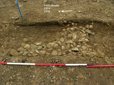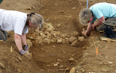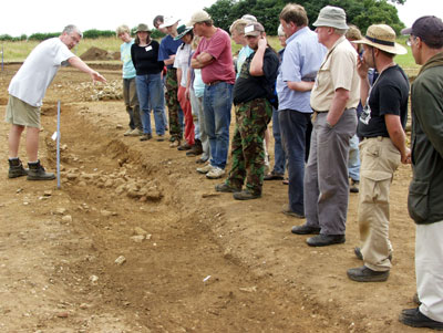 In the finds area they had a good few trays of bits and pieces to wash, sort and label, including some shards of late samian ware, an early roman pot and a George III penny (but we're not interested in that!) from the new round house. Day 5 of 20: Friday 1st July Much the same work pattern as yesterday. The supervisers and Site Director Steve Young took time out after lunch for a brief meeting to discuss the finer points of survey data and the recording thereof - after much technical talk it was agreed that the back of the context sheet was the answer.
