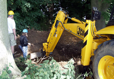 Ollie, possibly the world's most delicate excavator driver, was with us for today only: he shifted the spoil heap to the East of the site a few yards further eastwards, and cleared the topsoil where it had been - it's one of the unwritten rules of archaeology that wherever you put the spoil heap, you'll need to move it sooner or later! In the process Dave, our metal detectorist, found half a dozen more coins to add to our collection of several hundred.
