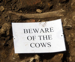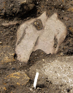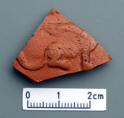 More pottery has been found here, including a nice fragment of decorated samian. . So, what's the mythical beast? A griffin, a harpie... While we're on the subject of animals, Moley has not yet returned to the lower slope, but we have found a horse (?) skull and a cow's leg bone.