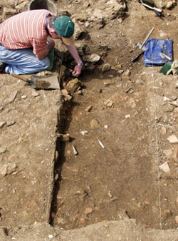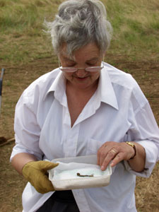 Maureen found and successfully lifted a bronze fibula (brooch) nearby - unfortunately it was broken long before she uncovered it. She's an experienced digger (mainly at nearby Piddington) but had never found a bronze object before. For a close up of the fibula, see week 4, day 18. Meanwhile, Jeff, a very welcome returnee Time Team volunteer, has at last learned (Barbara has her methods) to resist the temptation to remove pieces of pot from a section.... Jeff... JEFF... don't do that... phew!