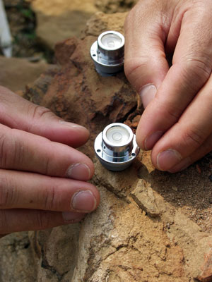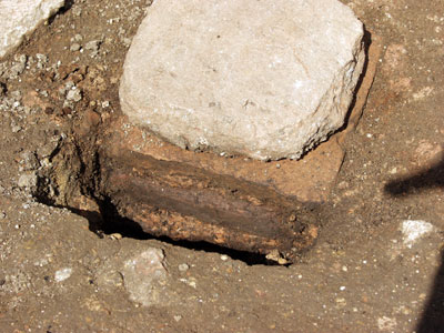 The samples are taken stuck to a button which Mark set to be exactly level, and on which he marked direction of the sun at a particlar time - that enables Mark to calculate the declination and bearing of the sample's magnetic field. Mark compares this data with known declinations and bearings at different times in the past. It's a very complex technical and statistical operation, but it provides at best, depending on the strength of the magnetic field in the sample, a date (or small choice of dates) with an accuracy of + or - 25 years! He took samples from the stoke house where the hypocaust heating system had scorched the arches of the tunnel leading the hot air from the furnace into the hypocaust itself. He also took samples from the burnt out post pads of our post-roman timber building.