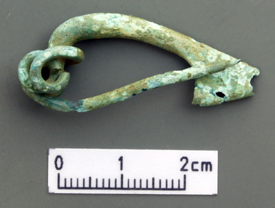 Work continued on the round house and lower slope, with steady progress, but no headline making news. By the way, the "horses" skull (not my idea!) turned out on excavation to be a boring sheep (or goat's) skull. Sorry. Here, at last, is the bronze fibula (brooch or clothes pin) excavated by Steve at the north end of the villa range: