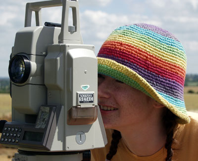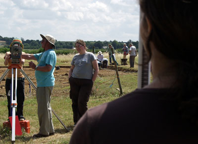 Amy, Holly and Clara took time out from digging in the round house to have a lesson in using the theodolite from volunteer Colin, a retired surveyor with a distinctive hat.