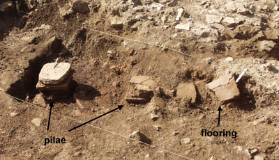 Down on the lower slope the day ended very dramatically with the unearthing of several pilae - the short pillars, made of stacks of tiles, which held up the floor in a room with a hypocaust providing under floor heating! There was a bit of floor surface too.