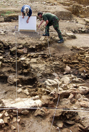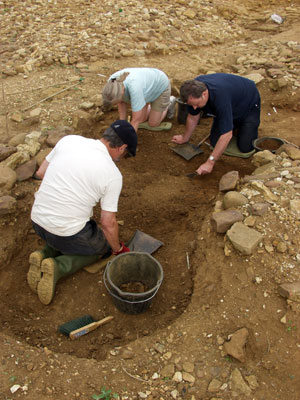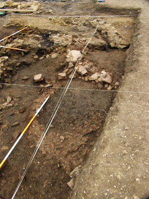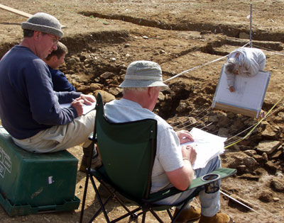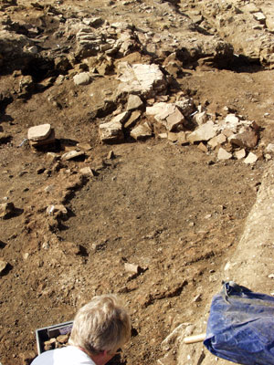 Down on the lower slope they've uncovered a roundish line of reddish stones, with darkish brownish soil inside it - possibly a spaceship launching pad or even a plunge pool (silly idea).