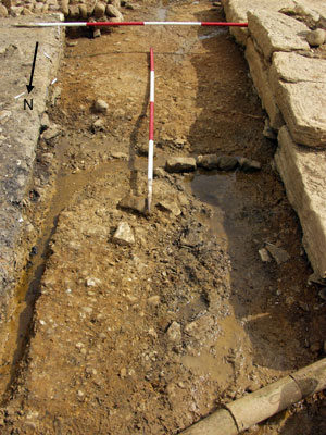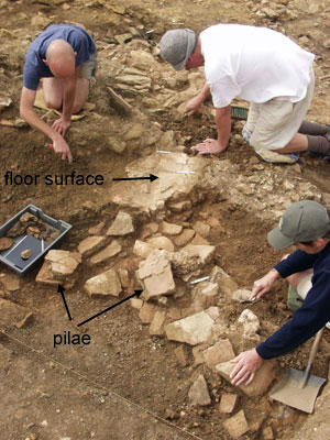 On the lower slope they have established the line of one wall of the new building. The wall, the pilae and the line in the floor covering all align perfectly. Steve bemoaned that fact that there won't be time to get as far as he would've liked in uncovering this building - there's another unwritten law of archaeology hidden in there for you to find!