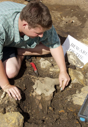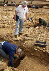 Nearby, Andy has started to lift the large skull which started off as a possible horse, then became a sheep or goat, but has ended up as definitely a cow. Note how the sign hides the animal name, just in case... No activity again on the round house, except that Paul spent some quiet, lonely hours planning it. I spent the morning with my laptop in the seclusion of my green tent working on a new introduction to the villa for this website: Jeff (of "leave-bits-of-pottery-in-sections-please-Jeff" fame) pointed out to me that newcomers to the site are offered no easy way of getting up to speed. I had come to much the same conclusion myself, but it took Jeff mentioning it to move me to do something about it! Polite suggestions are always welcomed! Thanks Jeff - the new page will be online soon. Jeremy Cooper Day 18 of 20: Wednesday 20th July Nearly there! Australia, that is. Steve liberated several diggers from the frustration of trowelling a millimetre at a time, and told them to dig deep.