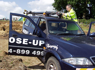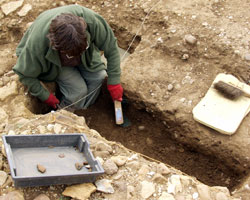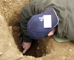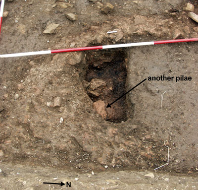 The day started overcast and threatening rain. But the drizzle held off long enough for Aerial Close-Up to do their stuff, and the light was perfect - no shadows to confuse the archaeological detail. Ever since 2001, John and Richard have photographed the site using their unique rig that puts a camera (stills or video) on top of a mast that can go up to 70 feet and look almost straight down on the site: there's a video feed to ground level and the camera can be zoomed, panned and tilted to compose the shot. I know that the people working on the final stages of planning and context plotting are frustrated at being asked to clear the site for the hour or so we need to do the aerial shots, but the photos are an invaluable archaeological record, enabling us both to look in detailed plan view at certain areas, and to relate all the different parts of the site to each other - and from several different angles. Aerial Close-Up's work for us makes Whitehall probably the best photographed site in the country! Thanks John, thanks Richard. Click here for their website. So I won my bet - please send me my winnings! Doc Martin did indeed attack the enigmatic feature after the end of play, and found - drum roll please - another pilae! And perfectly aligned with the others, and the walls...