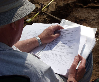 A quiet, cerebral day on site today, as the emphasis switched to planning. So tape measures, strings, planning grids and people bent low over drawing boards seemed to take over the site. No sound of mattocks mattocking, or trowels trowelling. Plenty still going on in the finds area though, as trays of washed finds dry in the sun.