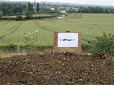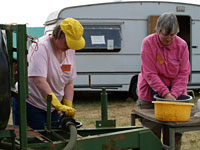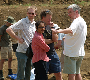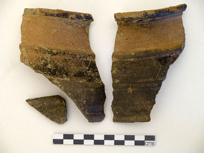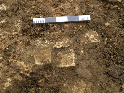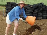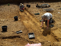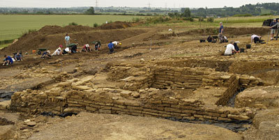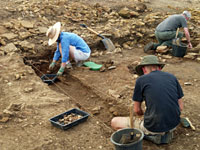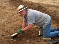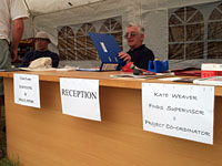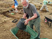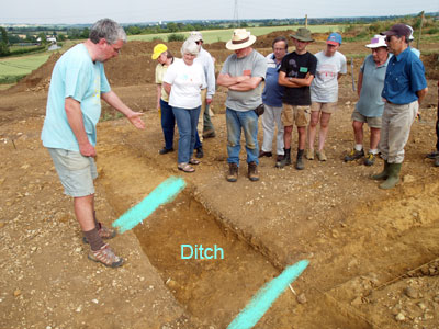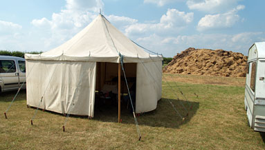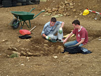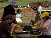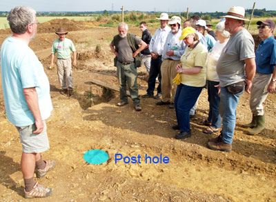First visitors of 2006: Tammy Day and Dr Bruce Winney of the People of the British Isles project visited to view the site and talk to us all about their project, which is to create a genetic map of Britain. They'll be back in the area in September for a public meeting at Weedon. If you, your parents and grandparents were all born in the same rural area, they'd like to hear from you. Check out the project website: http://www.peopleofthebritishisles.org Iron Age pottery: these fragments of the same pot were found in the fill of a ditch cutting diagonally across the line of the upper Romano-British drain in the courtyard (the one marked in a photo above): they show that the ditch fill is pre-Roman. And finally... I've just have to show you the medieval pavilion I've been allocated this year as my Media Centre. Great isn't it - so romantic! All I need now is a penant flying from the peak, a charger grazing outside and a suit of armour ready for me to sally forth... etc... etc. May be they think I work for the Daily Express. It's proximity to the dung heap is of course quite coincidental. Day 5 of 20: Friday30th, June Friday already - one week over! Steve conducted the traditional end of week site tour and he and Martin gave their account(s) of what's going on. The courtyard has proved to be a thin layer of archaeology, but the pre-Roman ditch and the oh-so-solitary posthole are interesting.