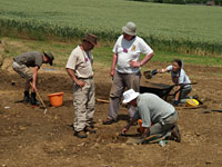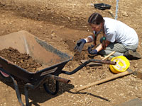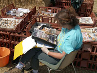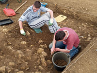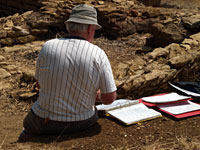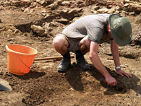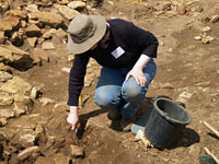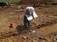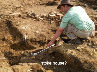 The new bath house may just be a winter dining room - posh underfloor heating to take the edge off the frozen peas. Its likely that we've found the furnace for the hypocaust and the flue leading from it into the rooms. But which way round did the rooms lie - along the hillside, or (like the old bathhouse) up and down it? Steve is happy that the weeks exploration has yielded good results. Next week there will be further exploration to help decide where to take out the current surfaces to see what lies lower down in weeks 3 and 4. There may be as much as 18" (45 cms) of demolition rubble (most of what we can see now) to take out before we get to floor level. Before I go - a new media service has been introduced this year. Supervisors can request working photos of their areas which can be printed and returned to them in minutes - they can then mark them up to help them keep track of developments.