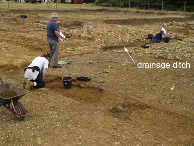 2. The courtyard area: at last it's time to dig down and find out what lies beneath the courtyard area. Will we find firm evidence of the "missing" East Wing? For the moment, one of the drainage ditches (the higher one) is being widened, and a narrow strip is being excavated running at right angles to the drainage ditches.