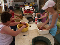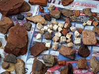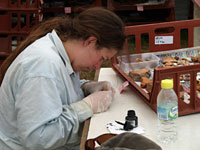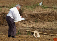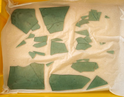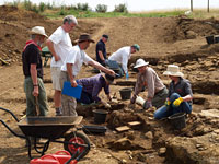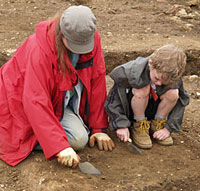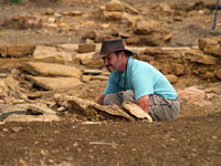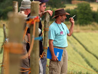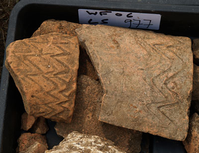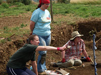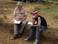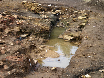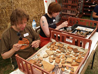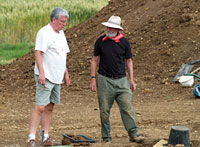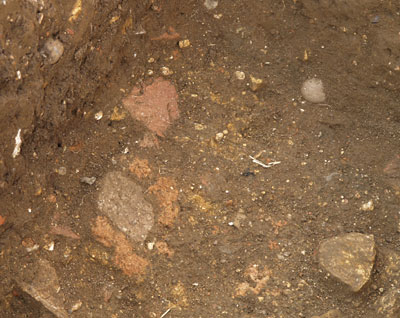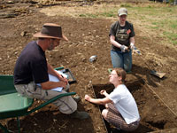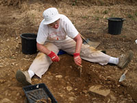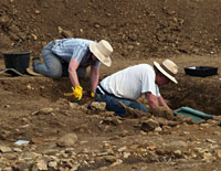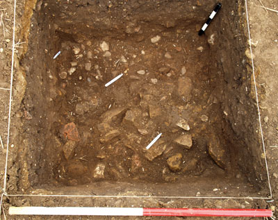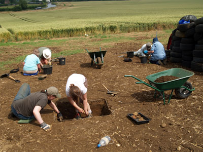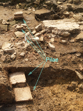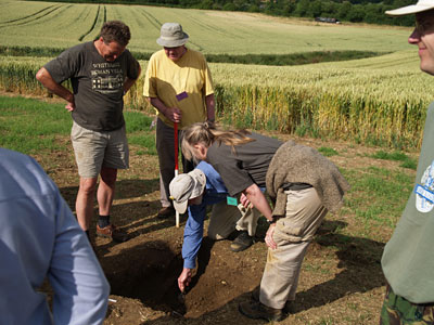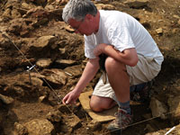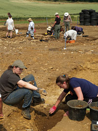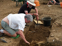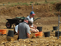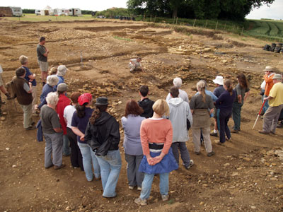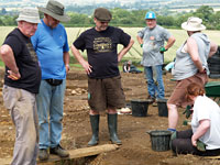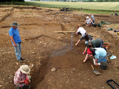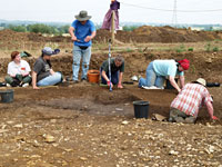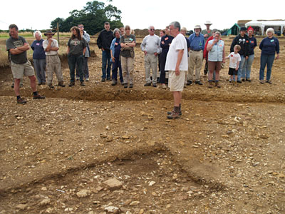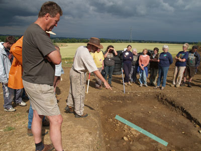 AN OCCASIONAL PROGRESS REPORT Day 7 of 20, Tuesday 4th, July More diggers this week. Sweltering heat - only Mad Dogs and Englishmen! Or should that be Mad Dogs and Archaeologists (cue to rewrite the Noel Coward classic? - click here for the full text of the original). But the weather broke late this afternoon and work ended a few minutes early to get everything under cover as a great black storm swept out of Mordor to the South East. Some interesting finds: Romano-British window glass from the lower slope - Brian jigsawed the shards together: It's translucent, but not transparent - perhaps from the privy? Decorated imbrix tiles from the North face of the new bath house: We've had some decorated imbrix before, but it remains rare on this site. Being on the roof, the decorated tiles would have to be carefully placed to be noticed - perhaps along the lowest row, or up the side of a low roof. More pilae in the new bath house: The two pilae in the foreground really are bigger than the ones behind - they are in a different room. No major progress in interpreting the archaeology so far this week - but a sense that real progress is being made. Day 9 of 20, Thursday 6th, July It rained! How it rained! Not much was achieved on Wednesday and this morning, but this afternoon progress was made. The main areas of the new bath house were well and truly soaked and far too fragile to work on. So the focus shifted to the lower slope South of the new bath house... ...where the existing edge of excavation was moved back towards the East. There are some interesting soil colour changes as you can see from the grey patch in the middle of the photo. The other area investigated was to the East of the lower bath house area (that is the area below the original bath house) - down the hill towards the crop line... ... where test pits were opened up. One of them had some archaeology! Not a complete surprise as the geophys shows that there is archaeology right up to the crop line. Where will it all end? Day 10 of 20, Friday 7th, July Sorry about the misbehaving links to Week 1 and back again - entirely my fault and all better now. So here we are, half way through this year's dig ALREADY! Today's Friday site tour, confirmed that progress is being made and that the understanding of some fairly subtle aspects of the site is being increased. I won't try to explain them here (phew!). Less subtle is continued confirmation that the archaeology stretches eastwards towards the crop line. At the eastern limit of the "new bath house" area they've found a clear edge to a stone layer, pointing towards... ... a similar layer found in test pit 1... A path perhaps? Meanwhile in the unfinished test pit 8, the furthest out towards the crop line... ... there is abundant archaeology including boxflue tile... It's rumoured that local bookmakers are now taking bets as to how long the Whitehall dig might run - will it rival Piddington for longevity? Have a good weekend! |