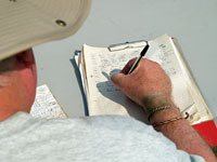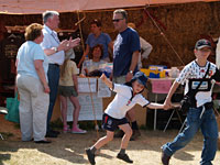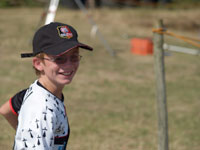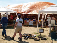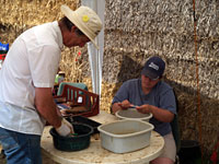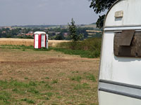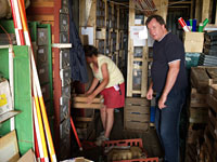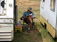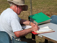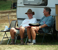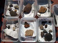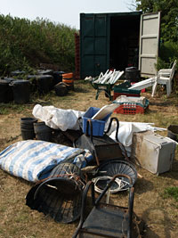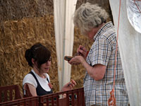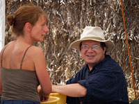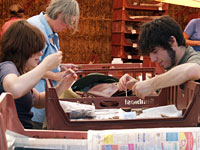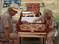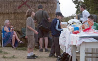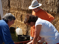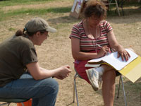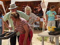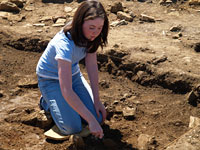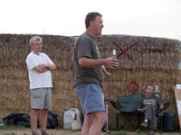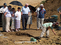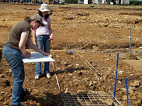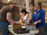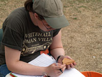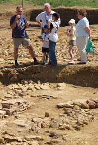 They've found some colour-coated Nene valley pottery close to the join, and (just before close of play) a green patch, which almost certainly means a bronze remnant: Dave the Detector will be checking the green bit tomorrow (we hope) to see if it is metal. Now don't get too excited, but we have a record of turning up the most exciting finds on the last day of the dig - so, watch this space. And finally (apologies to English language purists - although not starting a sentence with "And" was only ever a Latin rule!)... Dr. M's proposed collective noun for context hunters is "a speculation". That's the winning entry so far! Only one actually. Oh well. Day 20 of 20, Friday 21st, July The last day arrived and there was a general feeling of winding up. Not in the teasing sense, of course, but in a mood of, I think, quiet satisfaction that deeds had been done. While some planned, others still dug, but not for long. The finds area ran out of finds to process, and by mid-afternoon had been dismantled and packed into the container for storage until next year. When the last planners cleared the new bath house area, yours truly did a quick photo shoot while Steve began the final site tour of the 2006 dig. I missed Barbara's talk about the break-away dig in the upper villa range. I was going to tickle her until she told me all about it, but Chris sent us the following press release. It is, Barbara assures me, a brilliant account of the proceedings: