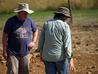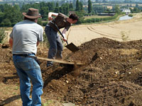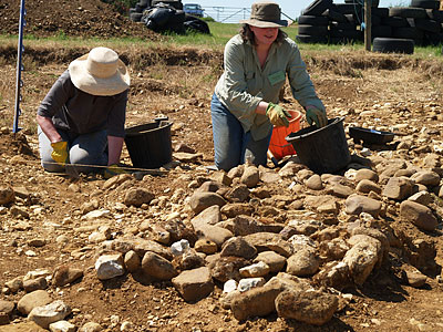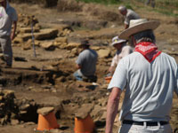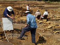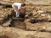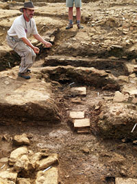 AN OCCASIONAL PROGRESS REPORT Day 16 of 20, Monday 17th, July A scorcher of a day - the little breeze there was, was very warm. Way above heat exhaustion danger temperatures! Diggers beware. Expected to be even hotter tomorrow. Phew! Anyway, Dave H. will be OK... He's got a new hat. This is at least partly so he and his gang can roam unrecognised and hunt down missing contexts. Any ideas for a collective noun for context-gatherers? Or perhaps a name for our trio? Down in the new bath house area (new readers please note that it may well not be a bath house, and therefore not the "new" one), they've uncovered a large slab which may be part of a very fat pilae... The buckets are covering the first two pilae found down here last year. Just East of this, a new bit of foundation has been excavated... Barbara - this time with Julia, and smiling - has moved over to the other side of the villa foundation to examine the ditch there... Meanwhile Dave D. ...