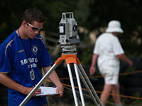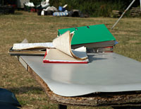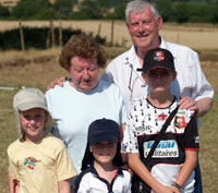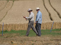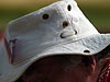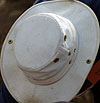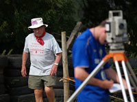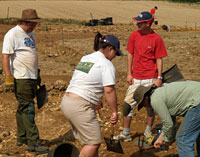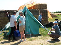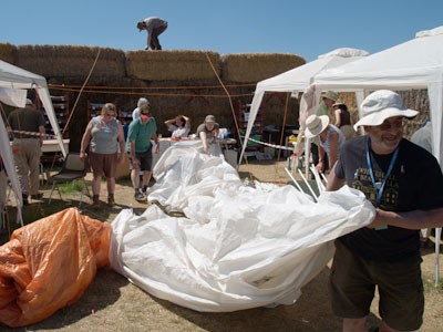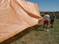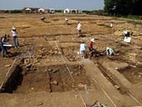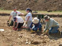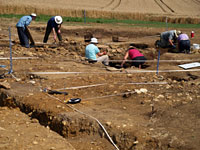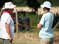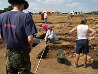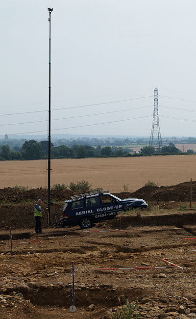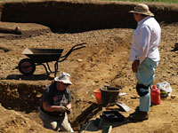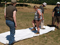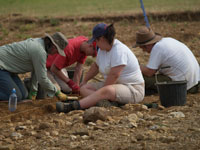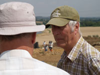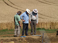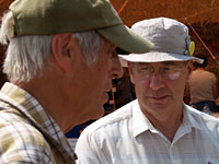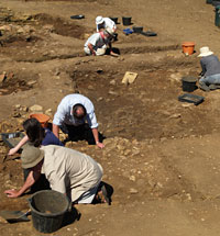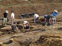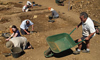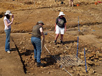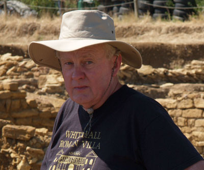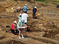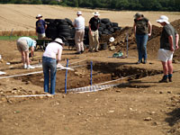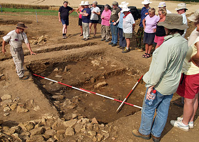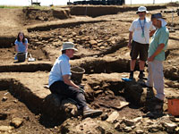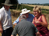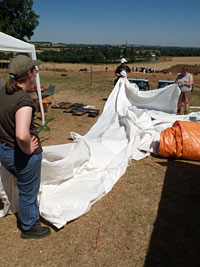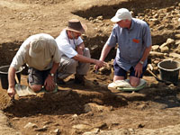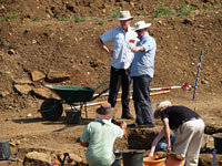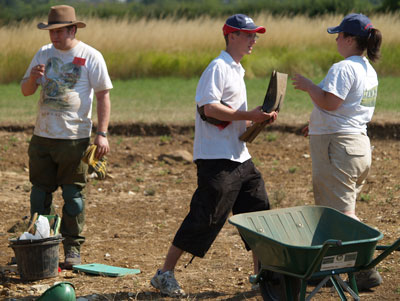 Day 18 of 20, Wednesday 19th, July At the risk of repetition - it was the warmest July day on record! 36.3 degrees C registered somewhere near Gatwick: they must have had their air conditioning on because I'd put money on it being hotter than that here! It was windy too, providing much exercise for the new orange cover... It made working in the finds area feel a bit like serving before the mast. Nobody was flogged though. One of last year's Time Team volunteers, Chris, came back for a re-shoot today and brought two air cadets with him, Antoni and Esther... Thanks for your help on the upper villa range guys - sorry it was so hot. Here's a photo I took yesterday. It's the lowest side of room 3B - the famous sealed wet context that yielded up so many treasures to us. You can see that even un-sealed, it stays wet through the hottest weather... It's really too hot in my humble garret to spend too long on this. So please excuse me if I cut it short. But before I go, a note to continue a conversation about the evolution of the English language (it started with a moan about the misuse of apostrophe's): as well as a female yellow wagtail, a new technical term has been noticed on site, attributed to Dr.M, supervisor in charge of the new bath house (so it must be genuine): chibble v. tr.: to trowel effectively but with caution; chibbleated adj. having been chibbled. Day 19 of 20, Thursday 20th, July A bit cooler today, but still quite humid. It rained lightly in the early hours of the morning, but no damage was done to the site. This morning was dominated by the activities of Aerial Close-Up Ltd and this blog is dedicated to John and Richard Buller for the fantastic service they have rendered us every year since 2001. They're selling the business soon, so this will be the last year we'll benefit from their generosity and skill. They're a pleasure to work with and take a real personal interest in the development of the site from year to year. I know it's a real b****r to be cleared off the site when there is so little time left and a lot more to do, but the aerial close-up photos are an invaluable part of the site record which provide us with information we simply cannot get any other way. Thanks John and Richard - and good luck with whatever you move on to next. We know you'll be back to visit next year, and look forward to welcoming you. Lots of cleaning, planning, measuring and a bit of digging this afternoon. I promise much more archaeology in the last-day-of-the-dig blog - but it won't be online until (probably) Monday, as it's the barbecue tomorrow evening and then the weekend. Meanwhile, Alan (planning) suggested that a collection of hats might be fun. So here are all the hats to be seen on site late this afternoon..