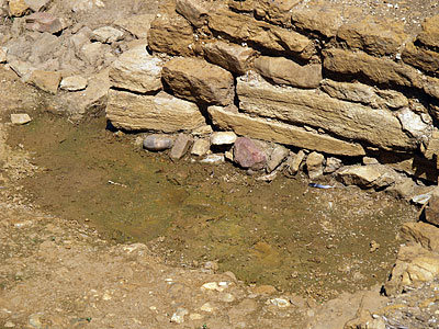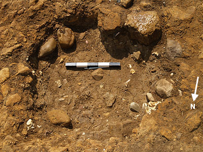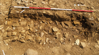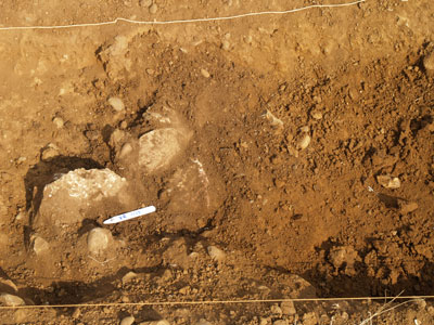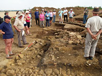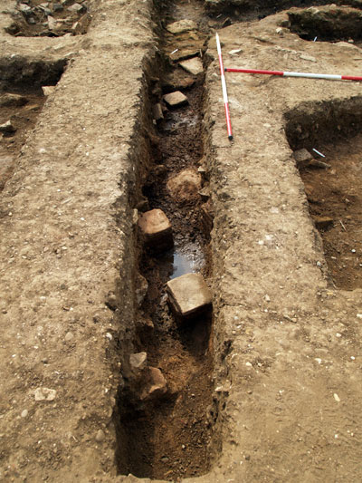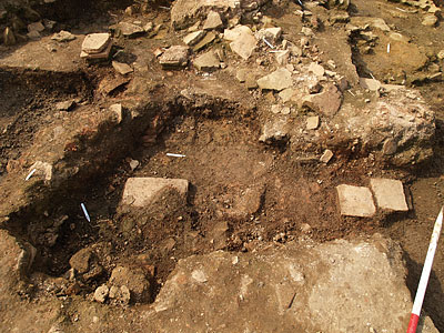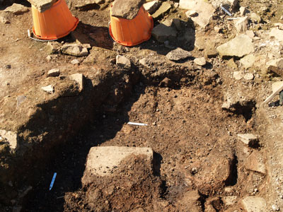 Thanks Chris! All I would add is that round house two is now officially 4 metres less in diameter that it used to be - a shrinkage from 13m to 9m. And, obviously, it doesn't underlap the West wing, so the current sketch map of the villa and roundhouses (as on the CLASP site) will have to be amended. Click here for a quick "photomerge" compilation of the trench: some of the boundaries and colour changes are caused by the "photomerge" process, so don't base any theories on them! Steve then lead the tour onto the courtyard, where I joined in the latter part. The most exciting development is that between the East-West drain (in trench E) and the bath house, and just next to trench A, they have removed the post Roman courtyard surface and found a substantial layer of Roman remains... Next year - says Steve - the whole of the paved courtyard is coming off to see the Roman remains below. Just to catch up, here's the post hole at the East end of trench B...