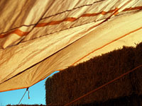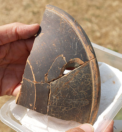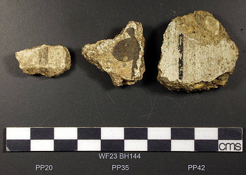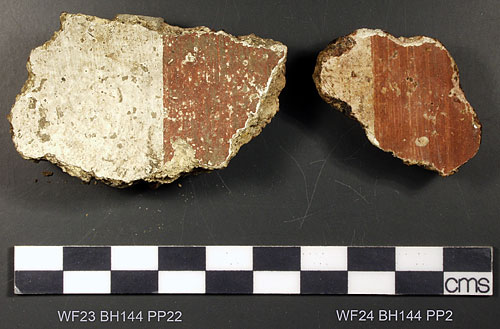 Day 17 of 20, Tuesday 18th, July Yup, it was officially the hottest July day on record! Tomorrow will be even hotter. And to add to the climate chaos, today was the day the roof blew off! Your intrepid cameraperson was elsewhere at the time... but was there to record the aftermath... So the big white gazebo has been folded away... and a huge orange tarpaulin (previously used for the environment tent - which also blew away!) has taken it's place. Some of us immediately thought of the sponsorship potential! As Chris said, it's Orange Wednesday tomorrow! "Orange puts the past in context"? So, much of the finds area now works in a kind of warm glow of light that makes the tiles look pale... No major archaeological developments to report to day. But here are a couple of photos of painted plaster I took this morning: Anthony Seminara, our friend who made the rotating animations of our burial's head and several pots (click here) spent a couple of hours photographing in the bath house - he's going to compile a virtual reality walkthrough! It will appear on this website in due course. Here are some more trivia: