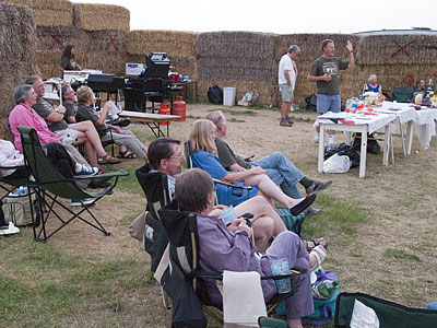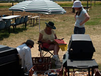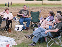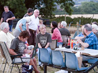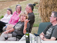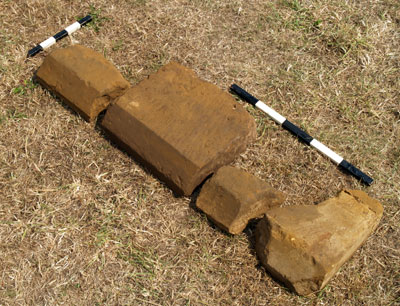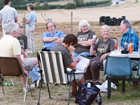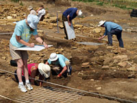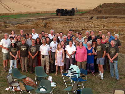 Down in the "new bath house" area (I'm going to call it "the mystery building" from now on), Martin layed out ranging rods to show us where he reckons the West wall (the back wall, presumably) was and a tentative stab at the position of the South wall... The mathematics of the pilae... shows that the room they are in was 5m wide. Apparently the double row of pilae would have been down the middle, so you can work from that. The circular feature... ... yielded up some fine coloured tesserae, so it's a good bet that there was a figured mosaic in this room. Martin reckons it was lifted out wholesale to be used elsewhere when this building was abandoned. Very little roof tile has been found in the mystery building, and much of the foundations have been robbed out: were these materials removed to be used in building the bath house just up the hill? Possibly. Pot and coin evidence suggests a 3rd century date for the mystery building, so it may that it is contemporaneous with the second phase of the development of the bath house. Both Martin and Steve were keen to emphasise that while we can construct and change scenarios to our hearts' content, we have no firm evidence for the use of the mystery building (no drains as would be expected in a bath house - but they might be further down the hill anyway) and we don't know its alignment yet - along the contour or cut into the hillside like the bath house. Much remains to be discovered next year - and beyond! Other bits and pieces: Here's a photo of the dressed stone, lined up as it may once have been in the villa - as a base for the portico or as a decorative feature... And here's Jane's latest pottery assembly of a nice piece of colour-coated pot... I have no photo of the dismantling of the pavilion - I was too tearful to see through the viewfinder. Here's the barbecue group photo complete with the rosy hue of a summer evening! Click on it for a bigger version... A photo of 'participants' only will appear in due course in the appropriate place. The barbie was excellent as usual - thank to Steve and Nick for cooking - and it was great to sit out above the site and not swelter! A good time was had by all. So, here's to next year! PS The virtual tour of the bath house is already on the website! Click here. Sorry about the clutter left in vision. Some of the 2006 aerial photos will also be on-line as soon as I have them. APPENDIX C Notae Academicae 1.1 Neil suggests "contextualisers", which is accurate if mundane but might led to confusion with the term as used in other branches of historical and literary discourse. He also uses the term "Context Club" in the title of his email. 1.2 Malcolm has sent this offering: