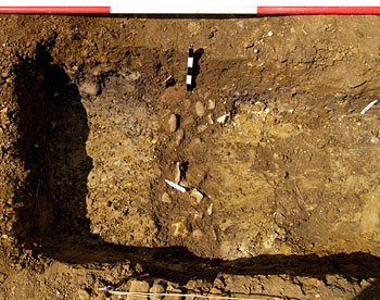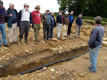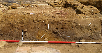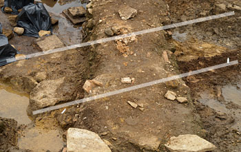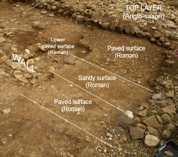 AN OCCASIONAL PROGRESS REPORT Day 6 of 20: Monday 23rd June Midsummer's Eve Interesting that Midsummer's Day is 3 or 4 days after the Summer solstice just as Christmas is 3 or 4 days after the Winter solstice - I suppose the ancients needed a couple of days of observations to be sure that sun really had passed the turning point. I expect there's different conventional wisdom about this - I'll look it up. Anyway... Not much to report today. Several more returnees turned up for the first time - good to see you back! Work on the baulk in bath house 1 provided a very nice section for me to photograph. Lots going on there! Down in the lower slope the position of another South-North drain was further defined - you can see it as the dark streek running top to bottom across this trench... with clay either side of it. It continues in the next trench along...