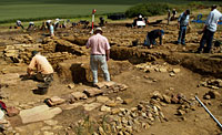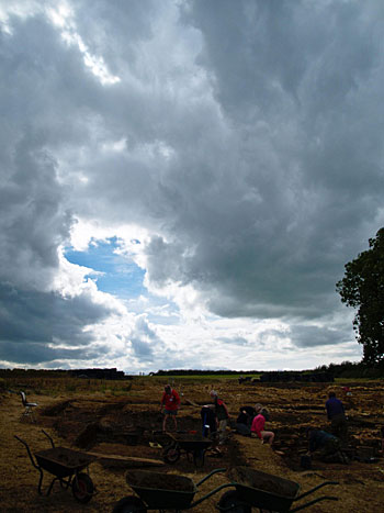 This rather fine mortarium rim came through the finds process. It was found in bath house 2. Here's an overview of the site, looking (more or less) North. It's a bit small to see properly, so click on it for a larger, legible version in a new browser window: make the window larger to see the image larger. A bit brief today - I need to go on-line to find a replacement for the Media Centre tent which collapsed in the wind over thge weekend with broken joints and ripped covering - it ws not really designed for such extreme conditions. But then neither were quite a few trees. Sic Transit Gloria. |
