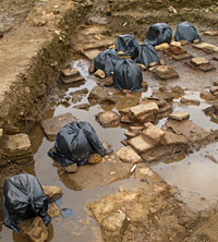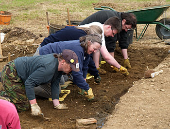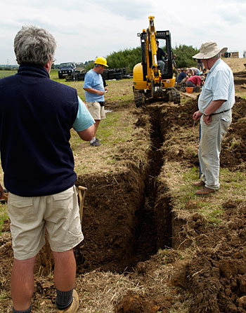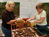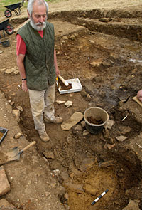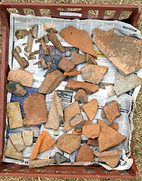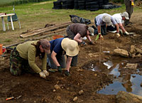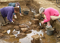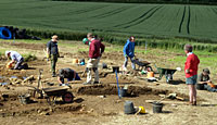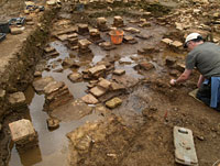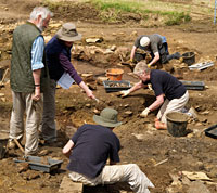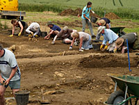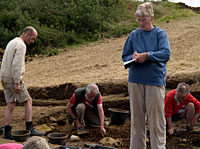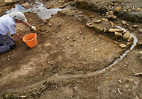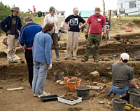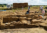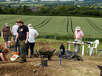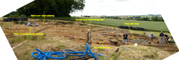 Ollie dug (and filled in again) three pits, to trace the drain pipe that runs from the bottom of bath house 1. He found it. He also dug (and infilled) a long trench along the bottom of the site to help with drainage. In the process he found a pebble layer corresponding to the ones already excavated nearby and to those found in the 2006 test pits in that area. Ollie also took the top off the area adjacent to the current excavation to give everyone a running start at extending the area. He didn't put that back. Everyone had to come off the digging while Ollie was working behind their positions. With the diggers transferred to the finds area for much of the afternoon, the backlog in finds processing was quickly cleared. All for now - I'm off to celebrate Midsummer's Day. |