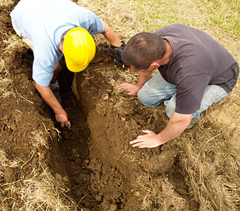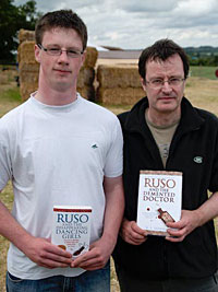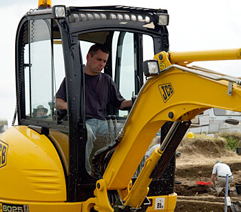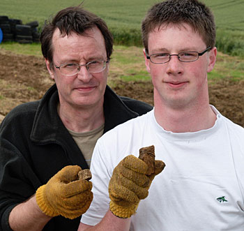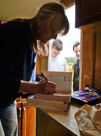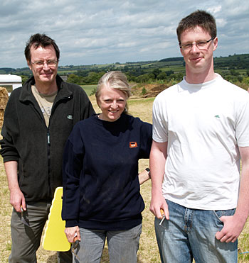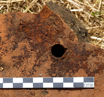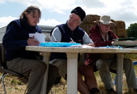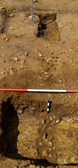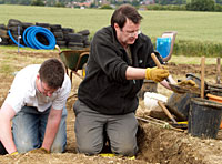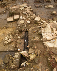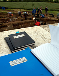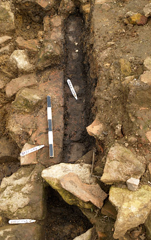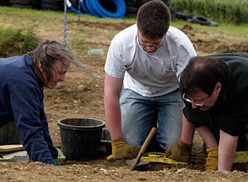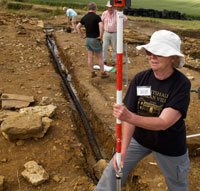 Prizewinners' Day Penguin, Waterstones ran a competition linked to Ruth's Ruso novels, and Karl and Andrew Thomason came to Whitehall today to enjoy their prize of a day on a Roman site. They had sessions with Nick and Steve, then Ruth and Barbara spent the day showing them finds and digging. They were first time diggers, so of course they came up with some finds - a tessera for Karl and a piece of box flue for Andrew. A very good time was had by all, and they may come back in future years. At the end of the day Ruth presented them with signed copies of her first and second novels (see photos right). Hole in one As far as I can remember this is the first large intentional hole we've had in a floor tile. It's a particularly heavy floor tile too, so perhaps the hole is the socket for a door pin. Is this the West wall of bath house two? It's a thick layer of mortar and it's where it was expected to be (see the small photo on the right), so... it almost certainly is. Well done all concerned. Weather from the West It was very windy today! |
