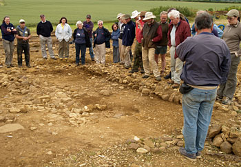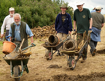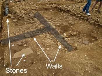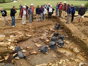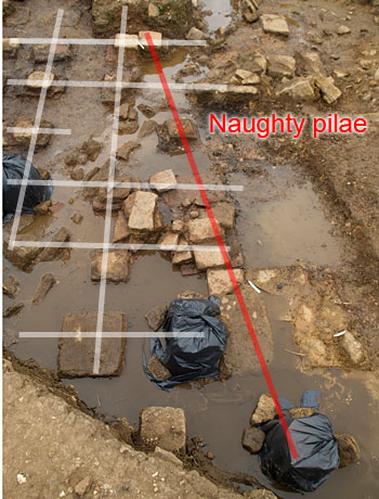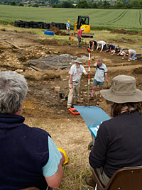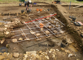 Less windy and a bit cooler overall. We'll cut straight to the chase... End of week site tour Barbara told us about developments in her area. This is an overview of the South end of bath house two. The West wall is definitely the West wall, if you get my meaning. You can see it clearly on both sides of the baulk - which will be taken out soon, over the wall at least. The pilae are misbehaving: there is a rebel rank of them striking out from the dull conformity of the grid (maybe they're from Milton Keynes). No sensible explanations yet. It looks likely that there are still lots of pilae to find as the dig extends eastwards, but the predictive algorithms are now looking less dependable. The East wall is looking as though it might be here. This is the channel from the possible stoke house to the hypocaust system of bath house 2 - it's been brilliantly cleaned by Rick. Tony showed us the cleared drainage ditch. The bricks found in it are definitely pre-1784 (when standard bricks sizes changes). So "Post-Mediaeval" is still quite approptate. Further up, the excavation of the paved courtyard area has been widened to East and to West to reveal a whole load of fascinating features, especially at the West end. The sequence of surfaces is now very apparent. There are these walls emerging too. Steve says it's a porch for the bath house door. Tony prefers "veranda". The stones marked on the photo above are exactly like the ones used to line the post mediaeval drainage ditch. The one in the foreground is still in situ at a Roman level. The bath house is now looking wonderfully clean (seems appropriate!) and the detailed analysis continues. And finally... The Friday afternoon wheelbarrow handicap shows Fred clearly in the lead at the first corner. Next - week 3 (already!) |