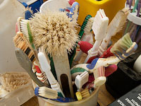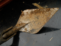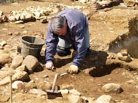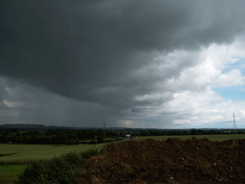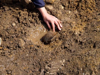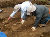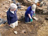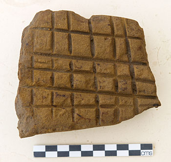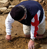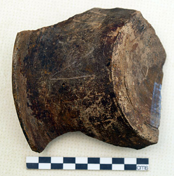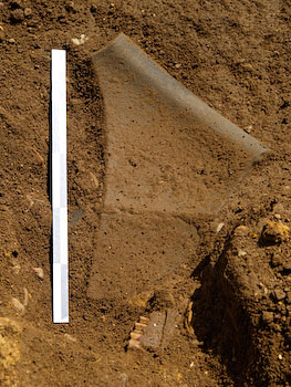 Showery today, so again, not as much digging as desired. So not much archaeology to report. Fred has taken up on-site brewing*. Shirley unearthed a large piece of pot. (See right too). Dan Windwood visited - he's the archaeological advisor to Northants County Council. Glenn managed the wound of the day, dressed by Margaret. He didn't cry. Dave visited with his grandson and gave him a site tour. He didn't cry either. The weather forecast for tomorrow is dire! _______________ *Customs and Excise please note. That was a joke: really he's priming a syphon to drain BH2. |