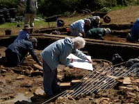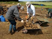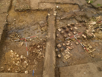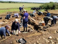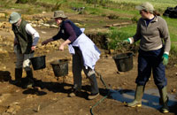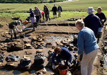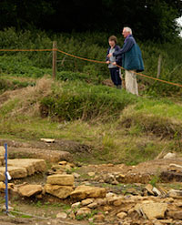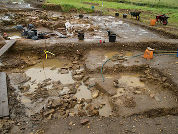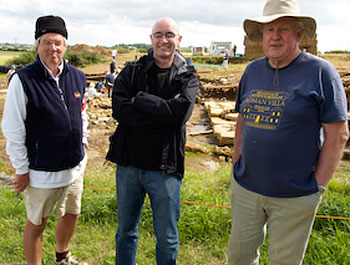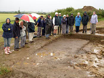 The boards are aimed at groups (expecially school children) visiting the site: they can be used by guides to help explain the site and it context, and have enough information on them to be self-explanatory. Much interest was shown in the specially commissioned illustration by John Hodgson, who is one of the country's leading Archaeological Illustrators - visit his website here. Postcards of the illustration were given to everyone present - they will also be sent to everyone who worked on the site this year but weren't present. after we've taken a breath or two, we will sell the cards on the website - probably as a set of four, like the images on the web gallery of the illustration (click here). I'll add an interpretation boards feature to this website soon. Lunch Lunch followed, with food and drink laid on for the guests - the leftovers were consumed in seconds byt he ravenous diggers. Group photo Then it was group photo time. See a bigger version and a list of participants here. A huge downpour was followed by intermittent showers and more site clearance. Site Tour Barbara talked us through Bath House Two. Yes, capital letters at last as we are as sure as we ever will be that this was indeed a bath house. It was built in the early 3rd century AD at the same time as the earliest development of the villa. It was possibly closed down when it proved impossible to deal with flooding from the spring line: a drain cut right across room two was an attempt to deal with this problem. Materials from BH2 were probably used to build BH1. An interesting titbit is that they built the trenches for the west wall foundations of room 2 and the east wall of room 1 too wide, so the trenches were infilled. The lower slope above the west wall has an ash deposit all along its length and this yielded many finds of pot, 11 coins, and window glass (most found last year but a large extra bit found this year). The excavation had proved to be more intensive than extensive - it was slow, going in some very tricky areas because of the delicate floors being revealed, so it had not been possible firmly to establish the line of the east wall, or to reveal more about the space and links between the bath houses: those tasks will be priorities next year. Steve announced that funding had been secured (today!) for carbon dating and for geomagnetic analysis of the praefurnium (furnace) in BH2 which will pin down dates. Tony told us about the courtyard area. The various levels of paved surface had been established and the walls clearly defined. (See Week 2 Day 10). Further work on the surfaces had revealed a multiplicity of contexts and it was eventually decided that they were really one context - that of an infill. Phew! The ring (see yesterday) and the large piece of greyware (also yestersay) came out of sealed contexts and might well help with dating. Next year the focus will be on establishing the exact relationships bewteen this area and BH1. Modern Drainage A final act of defiance in the rain (mostly) saw the digging of a drain at the north end of BH2. Very stinky it was too! A pipe was installed and the drain infilled - must remember that when we come back to that area next year! We then dispersed to reassemble later in Nick's grain barn for the traditional barbecue. The photo I took on my "little" camera was hopelessly out of focus (the only one this year - I put it down to too much Coke Zero!). It was of the three graduates of St. David's College Lampeter (University of Wales) who worked on the dig this year - Steve, Barbara and Jenny. An amazing coincidence (honestly!). If Steve's wife Helen had been there (she'd gone home a bit earlier) there would have been FOUR Lampeter grads together outside Wales - surely one for the Carlsberg Book of Records. And finally... The mystery objects - see week2 Well, of course they weren't a mystery at all, really. But the thousands of emails Nick spent days sorting through demonstrated a wide variety of ideas, some of them publishable! The carved up piece of stone-like material was in fact part of the exterior decorative cladding of BH2. The strange sandwich was of natural occurance - but since we have not found any more of it occuring naturally, it just might have been part of an ornament. Quiz Answers*: