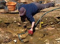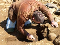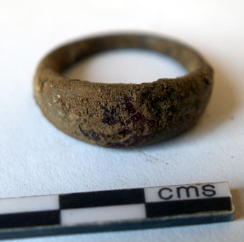 Paul Quinn of WNDC made a long visit to the site and was shown around just about everything by Dave. Find of the week - a bronze (or silver) ring with red glass intaglio, found under the courtyard pavement. I'm looking forward to seeing this one when it's been cleaned up. LAST DAY TOMORROW!!! |