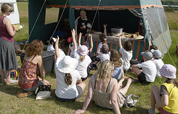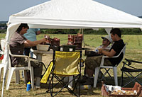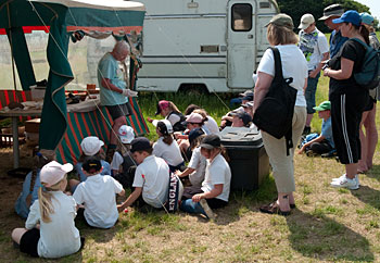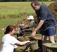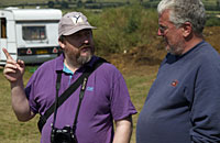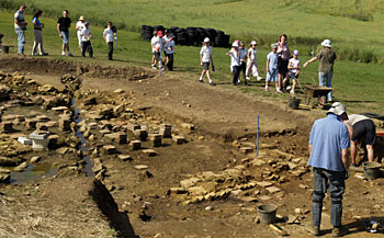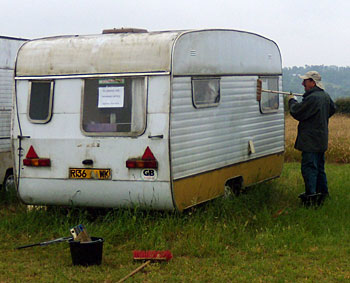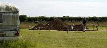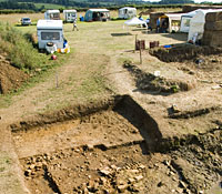 ... not enough evidence yet to say what it might have been. Over in BH1 room 4... ... Laura's work on the drain under the north wall has shown that the "capping" stones had in fact been used to fill in the drain when the drainage pattern was changed. It now seems that the water flowing from the sump was diverted along a missing drain outside the north wall - Tony is going to check the old photos to see if there was any evidence of this a few years ago. The area east of BH1 still needs more work to establish what it was. It might be a drain away for BH1. Fred showed us the hole with the Georgian/Victorian tile floor in it... This was probably an ancilliary room to the farm building which stood somewhere around here. The point of digging here was to find out whether any roman stone had been used in the Georgian construction: certainly none was found, and the walls seem to have been of low quality bricks. Fred also showed us the large hole which included the shadow of a round house wall, and... ... a Victorian or thereabouts drain which had shown up as a geophysical anomaly. And finally - during the rain this morning. it was decided at the highest level to wash the caravans so they look nice on Open Day.