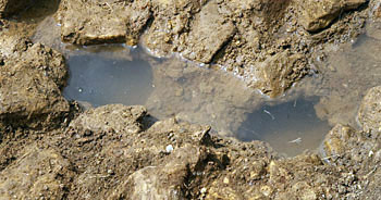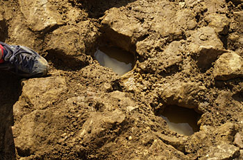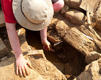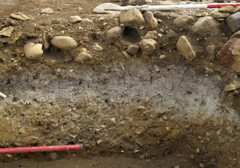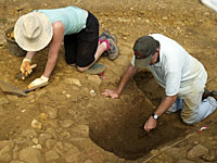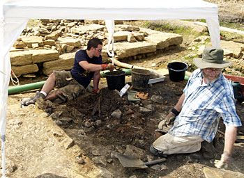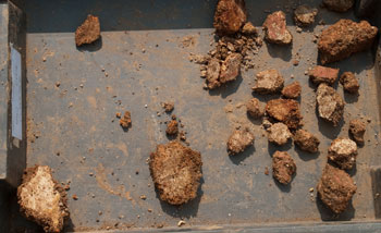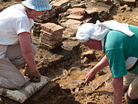 Lets talk about the drains. Two drain holes were found in BH2 in the vicinity of the South wall at the eastern edge of the excavated area: one of them had a wooden lining! This is how they looked yesterday... And this is how they looked today... Now, it didn't rain, and there are no visible links between these holes and the other water filled areas of BH2 at the same or a higher level. Presumably there is some sort of underground connection. Now let's talk about soil colours. I confess that I often can't the soil colour changes which send real archaeologists into raptures (even if I say I can, and even if I can enhance the photos to show the changes up better). But take a look at the spoil heap... No enhancement needed to bring those colours out. Meanwhile... ...Laura continues her intimate relationship with the drain underneath the North wall of BH1 room 4. Having slid the huge capping stone back using, it appears, paeleolithic methods (wooden rollers), she's removing the mud to see how the drain is lined. Rick spent the some of the day meticulously lifting lumps of painted plaster in the mystery area beyond the South wall of BH2... And here is some of it... Must have been a room here! Even more so because Rick spent the rest of the day revealing more pilae as the digging moves southwards. Tomorrow's site tour will be especially interesting! There may be some heavy showers overnight and tomorrow as the heat wave breaks. |