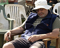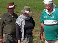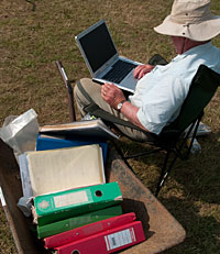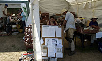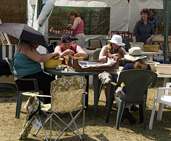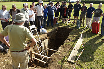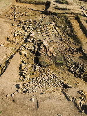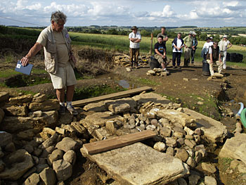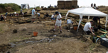 AN OCCASIONAL PROGRESS REPORT Day 11 of 20: Monday 29 June Cor what a scorcher! Ways of keeping the sun off: 1. A gazebo ... ... to stop some wood drying out ... ... while its excavated. 2. An umbrella: 3. A shemagh... ... as modelled here by Barbara (Willen Hospice stall at Folk on the Green - £2). I was myself wearing a green shemagh as issued to Coalition forces in Irag and Afghanistan (bought on-line, about £10). Bath House 2 continues to amaze and puzzle. More pilae are turning up on the "wrong" side of the southern wall. They are not in any sort of alignment with the pilae on the "right" side of the wall. In the photo you can see the cut through the wall which just might be the link between another stokehouse and the hypocaust beyond the wall. Too soon for any even tentative conclusions - but that doesn't stop people trying, of course. Meanwhile... The Trench is being painstakingly dug out. No great conclusions here either - yet! And finally, a find from last week... Probably a brooch - lovely scalloped edge. Sorry there's no scale - it's about 3cm in diameter. I'm not going up the site tomorrow - more Tuesday meetings which I can't get out of. If we're lucky we may get another guest blogger. |