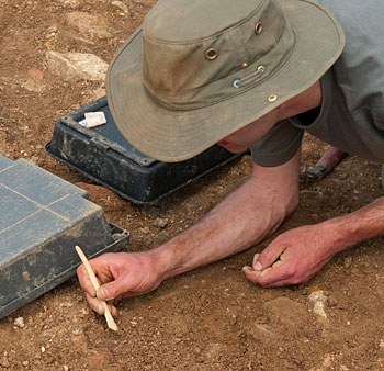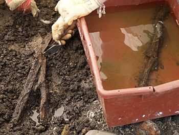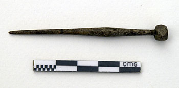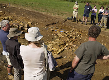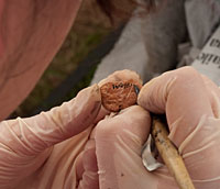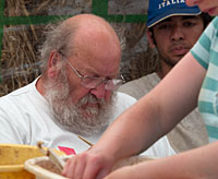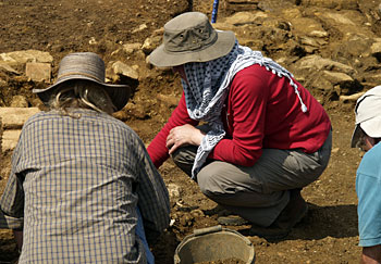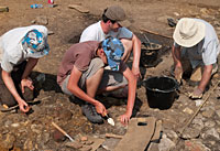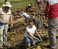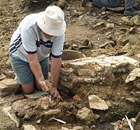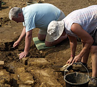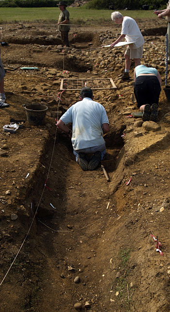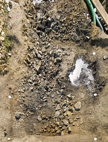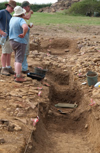 Day 15 of 20: Friday 3 July It rained. While BH2 flooded a bit, in many areas of the site the rain brought out the colours in sections, and was a great help in that way. Here, for example, is the edge of the courtyard where it meets BH1. Here's a hairpin which came up in BH2. With its multi-facetted head it's possibly the finest hairpin we have so far. And here's a nice painted pot rim... On the Friday tour Tony showed us the results of the ongoing search for the NE wing. Basically ... it's still missing! But a big thanks to people who carefully looked for it. On the other hand, The Trench is now confirmed to be an pre-Roman ditch probably related to the round house which was close to its top end. The pottery found here has been either iron-age or very early Roman - that bit of Samian ware is of a type manufactured in southern Gaul which ceased production in 60-80 AD - so it's very early Roman as far as the British Isles is concerned. At the business end of BH2, they've been looking for the join between the west and south walls of room 2... They haven't found evidence of it yet, but it might be deeper down. Meanwhile the south end (trans muros) continues to intrigue. The painted plaster suggests a standard dado design on the wall. There's a new feature coming up in this area...