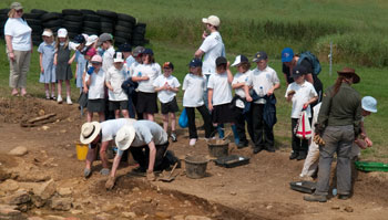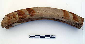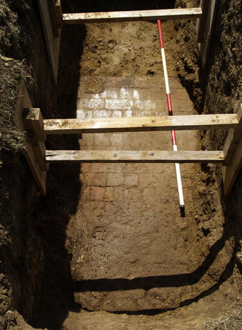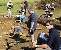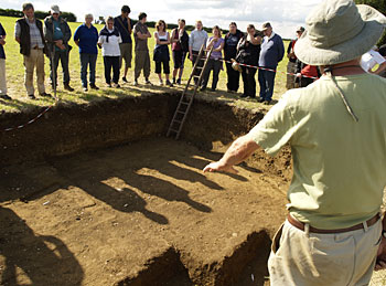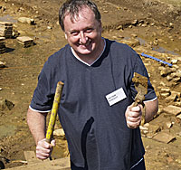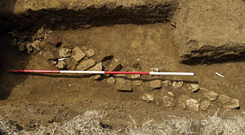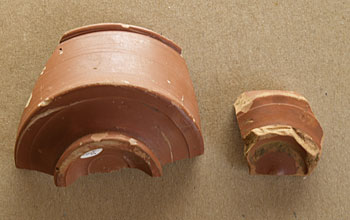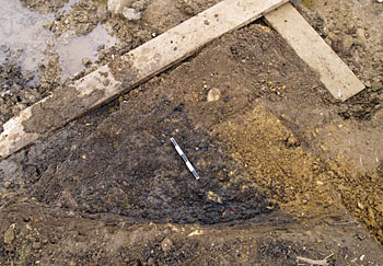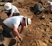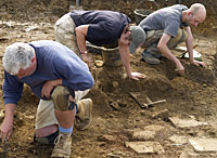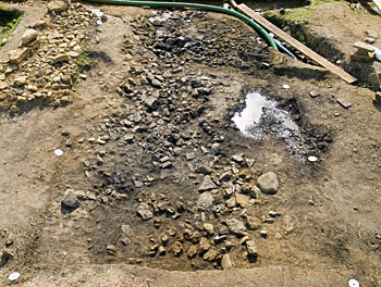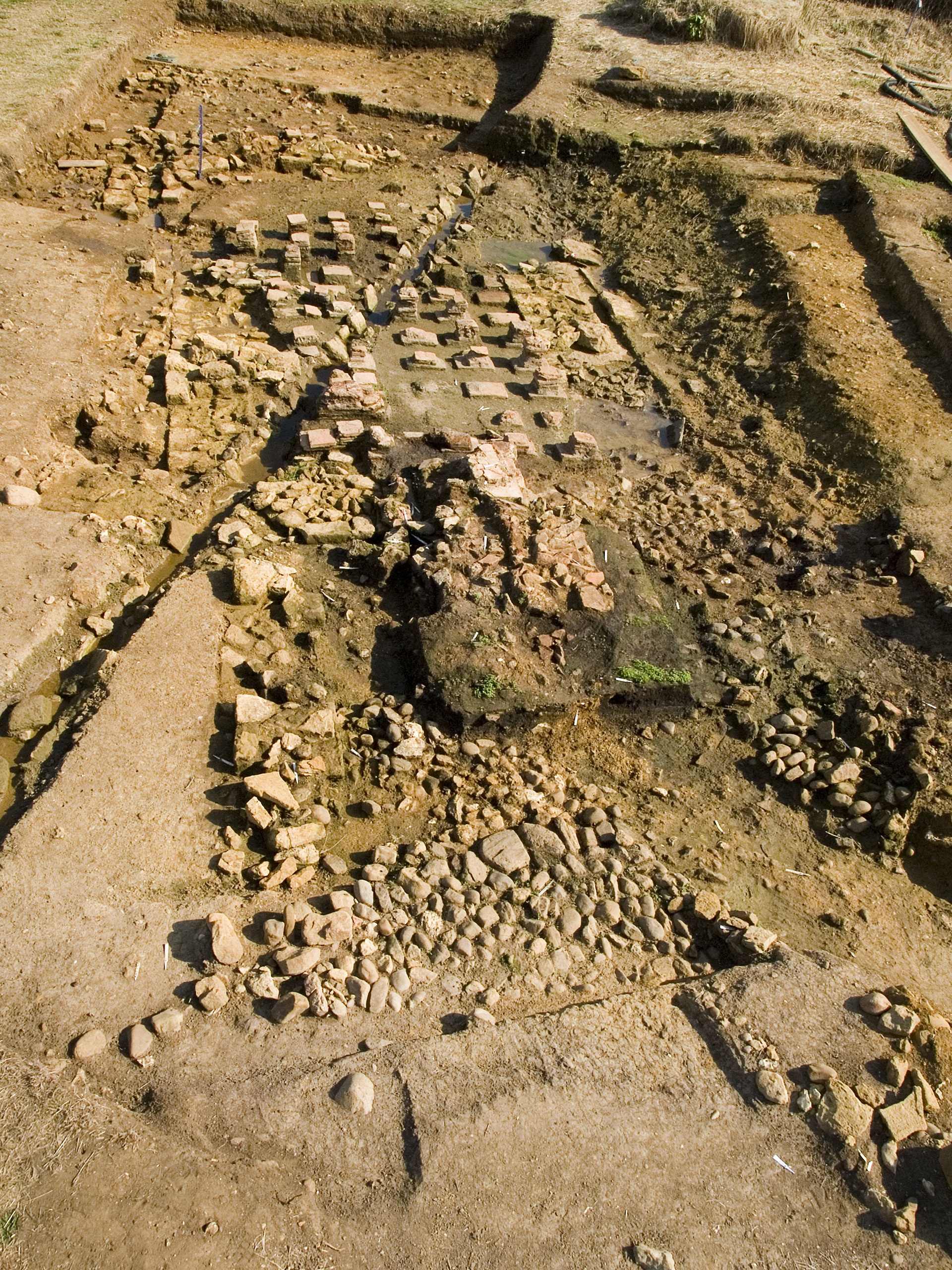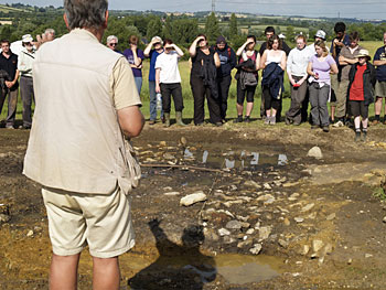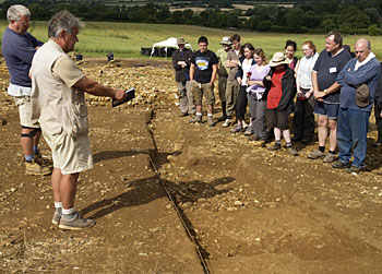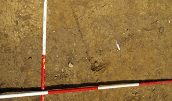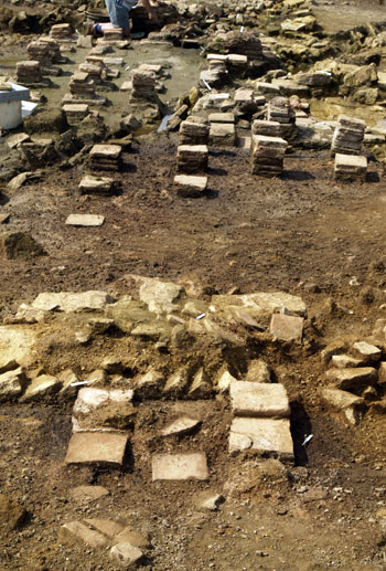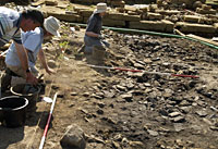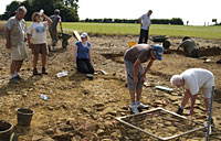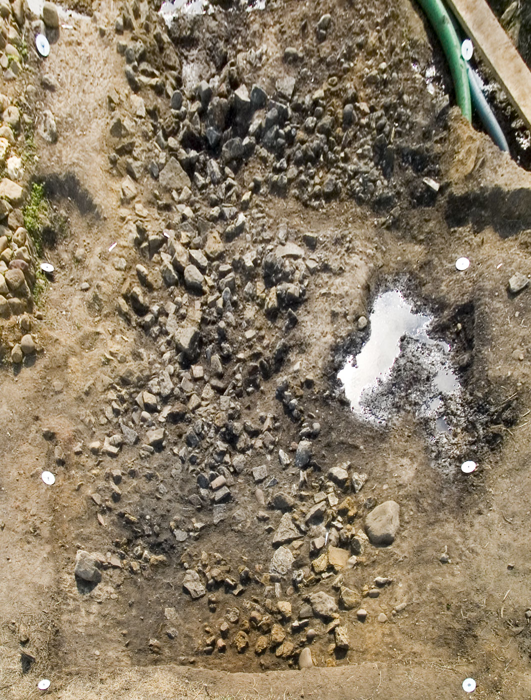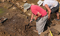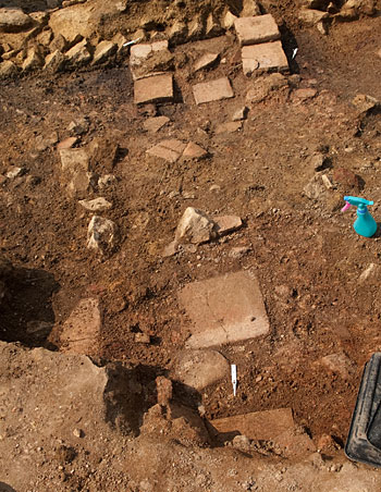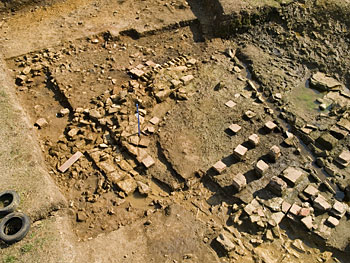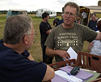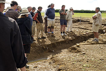 Day 13 of 20: Wednesday 1 July Children from Harpole Primary School joined us for couple of hours in mid afternoon today for a tour of the site... ... and a look at the finds. Harpole Heritage Group visited this evening. Several of the other villas CLASP (to which the Whitehall Villa project is affiliated) is looking at are in Harpole, and Harpole Parish Council makes regular grants to CLASP to support its work in the Parish. And we have a strong contingent of Harpole volunteers working at Whitehall. Just West of the caravans they've dug a big hole and found (ta, ta) Round House Three. It's a farily subtle soil-colour change - the foundation runs left-right across the cente of the frame. The two roundhouses we already know about on site were undoubtedly part of a larger group - and now we have some visible evidence for that. And while we're on the subject of extra attractions - this is the floor of a Georgian farm building just West of the copse (the one with the tool shed nestling in it). We've always known about the building, and believed that it was built using stones from the villa range (you can see it clearly on the old OS maps of the area). Apart from a few stones we haven't have much of it, until now! This is a nice bit of samian ware found in The Trench. Now don't get too excited - the bit they found is the one on the right: the really gorgeous bit is a profile sample from Rick's collection: it has the same profile as the bit we found. (Rick is our Samian specialist). I got a ride with Steve and Tony in the cage of the Matbro tractor at the end of the afternoon, and here's what we saw. Click on the photo for a larger version - they are big files, so may take a minute or so to download depending on your internet connection. The south end of BH2: All of BH2 and areas adjoining: The area East of BH1: I'll put up a perspective-rectified version of this as soon as I've prepared one. Famous last words?... No! Here at 22.52 (and I've done lots of other stuff imbetween) is a rough rectification: |