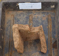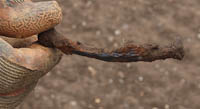 The area to the North of Bath House 2 where there is a spring and a sump of dark organic material was extended to the East with the mechanical digger and appeared to continue down the slope and an exploratory trench cut even further down the slope to see if it continued. There was no evidence at all of it in the trench. Work continues on taking this area down and there is a significant number of nails being found, this together with the very high concentration of iron contamination in the soil would indicate that iron was being worked here.