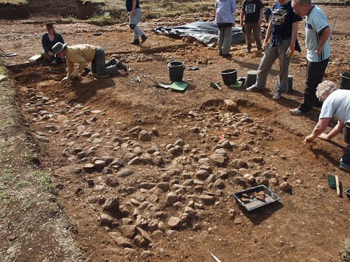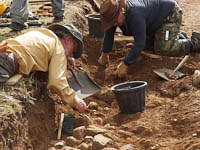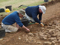 During the second week of excavation work continued in trying to establish if there was a link in the structures between Bath House 1 and Barth House 2. Having established that the blue/grey clay layer was common to both a section was cleared at both sides of the large stone layers at the North west end where there is a gap. A foundation trench for the stones was found in direct alignment indicating that this layer of foundation stones was continuous before it was robbed out. This means that there was substantial stone wall running from Bath House 1 to Bath House 2 and was terraced in a number of steps between the two. It's purpose is still to be decided.