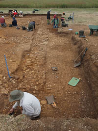 During the this part of the excavation it became clear that there was the outline of a trench which had been cut through the stones and the underlying structure, evidence of which can be seen in a straight line running right through the different rooms and structures in Bath House 2. During the excavation of Room 7 it was found and there remained a section of the fill, this is the only place where part of the trench remains. This was in turn removed but there was no material which gave an indication of it's date. Various sections of the trench were examined in particular where it cut through structures and it appears to end just outside of Room 8. The purpose of the trench is not clear. It is not a drainage ditch and it was not used to remove stone and there are no other associated cuts or trenches. There is the possibility that it may be an antiquarian excavation which was not recorded, as it post dates everything else in it's locality. Word has it there was a vicar with an active trowel in the early 1800's.