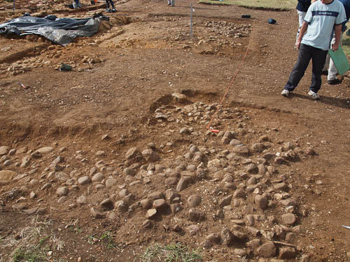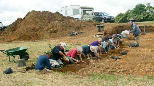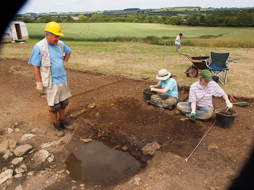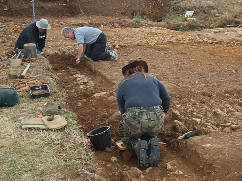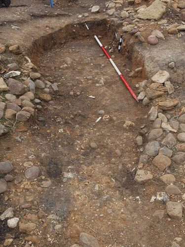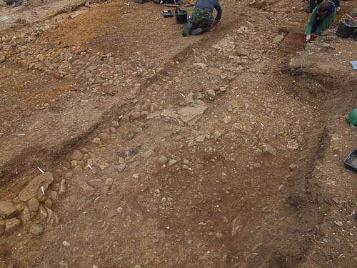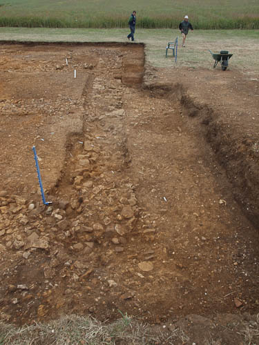 There is a corner joining this E--W wall with the N-S wall running across the top of frame just above the bucket and below the knee-protected jeans. You can just see in that corner some large stones uncovered right at the end of the afternoon by Wren, Andy and Fred...