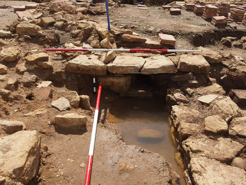 It's a foundation of pretty consistent (if mixed) construction along its full length. So it was probably built all in one go. There are three rooms running off it, each about 4 x4 metres. The foundations are pretty wide and would have supported high walls. The current interpretation is that this side of the bath house was a very impressive, southern main entrance to a suite of rooms preceeding the hot rooms beyond to the North.