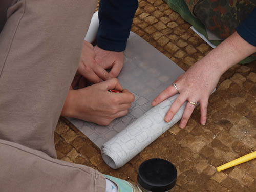 Laura (on the right) has been joined by several others (here by Jo) to trace the tesellated pavement. Yes, that's right, they're tracing it. Mmmmm...