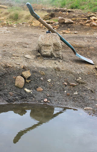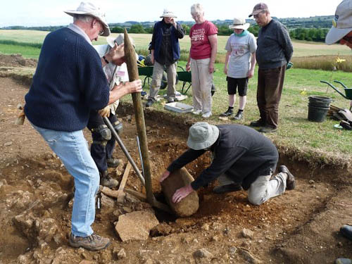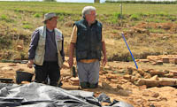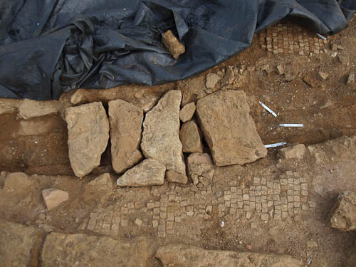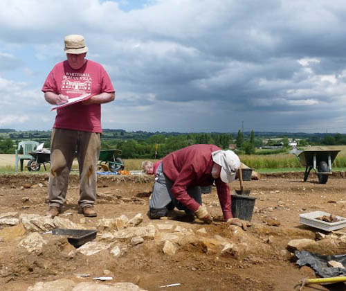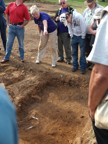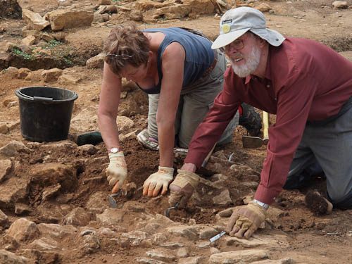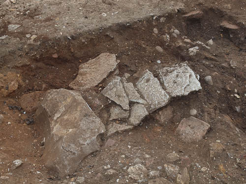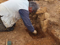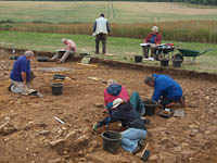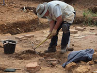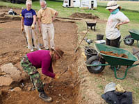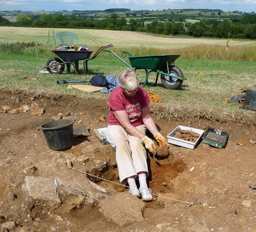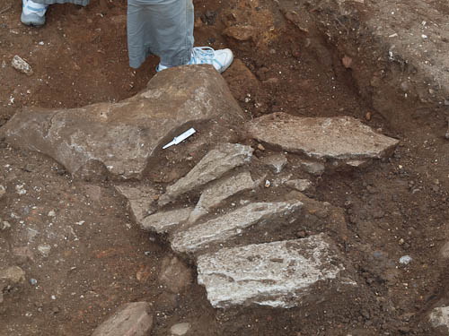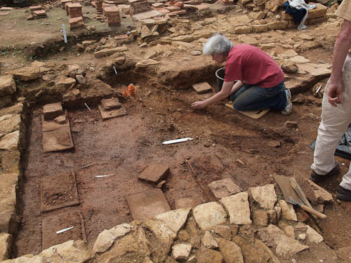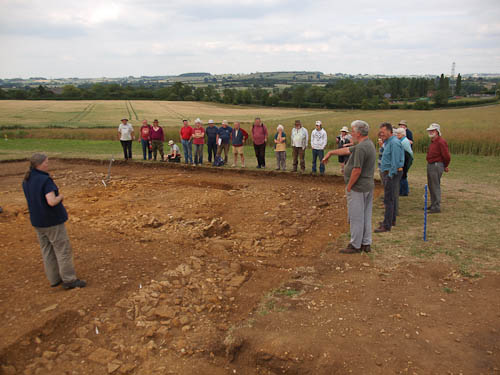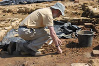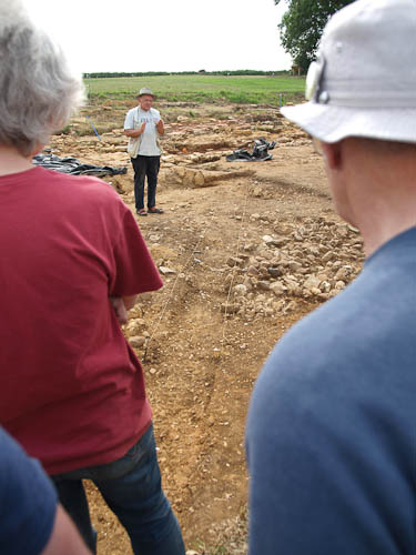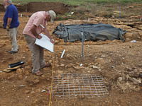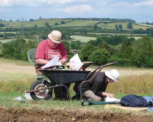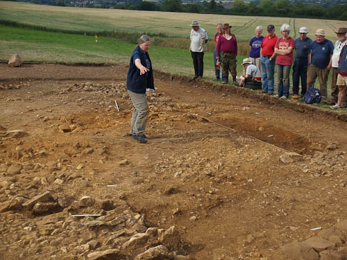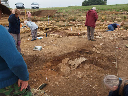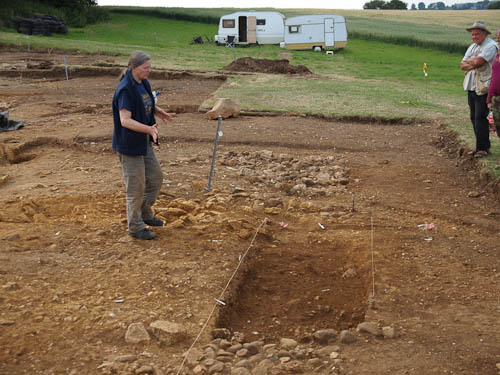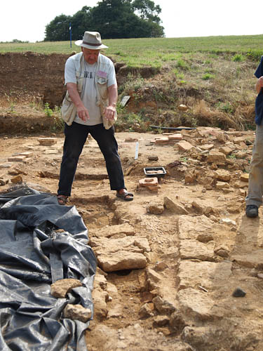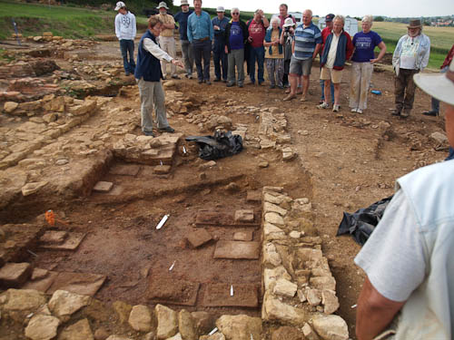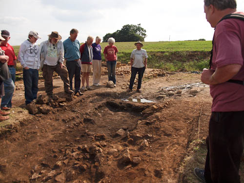 Day 15 of 20: Friday 1 July We then removed the material in the NW corner of the room, which had a great deal of burnt and badly degraded tile in it, as well as quite a lot of pieces of pilae and other tile, which was still in quite good condition. It's been a hard week in the south range but a satisfactory one. We can safely say that we do have 4 or 5 unheated rooms - 3 of which make up the south range of the building. ![]() These 3 rooms are where we've concentrated this week's effort in cleaning back the interior surfaces: (a) to see if any remnants of floor survive; (b) to see if there are any features of note inside the rooms and (c) to establish the wall lines. Well, the answers are (a) No, nothing you could really call a floor - the remains in the middle and west rooms are just sloping, rock-hard pebbly surfaces - not good to walk on or trowel! We're down at the foundation layer of the walls, so if they had survived the floors would have probably been at a higher level. In addition, as we're on a slope, the rooms would have had to be terraced. ![]() (b) We did find a very clear plough mark running from the middle room across a limestone "threshold" (pushing it out of line) and on into the east room of the 3. Now a certain VIP told us that a deep plough did get broken about 30 years ago - so we may have our clear first dating evidence for the features in this suite of rooms! (OK, we did also have a late 3rd/early 4th century piece of pot.) There are also odd areas of burning and debris scatters from the walls, duly noted but not spectacular. ![]() (c) We've found that some of the walls have an interior (and possibly exterior) mortar layer about 6 inches wide. So now we're using this as a clue to find the line of the walls, even where they have been robbed out or where the edges are jumbled with debris. Thanks to this we've been into the robber trench of the east wall of Room 10 on Friday, where Jerry and Dave satisfying found 2 bunter pebbles low in the trench. How's that for excitement - well you had to be there - it means a lot to us!! Just for fun those of you would like to try allocating functions to the unheated rooms: apodyterium (a changing room, with niches for your clothing), a palestra (a large central courtyard used as an exercise yard) a laconicum (a dry heat room, like a sauna) - taken from Lindsey Davis' Falco fans pages (defunct in 2023!). Sorry Ruth, I couldn't find a suitable Ruso reference: here's Ruth on Amazon anyway: www.amazon.co.uk/Ruth-Downie/e/B001JP8EN0/ref=ntt_dp_epwbk_0 We had fun one afternoon speculating that the burning in the east room was where they heated the stones for hot stone massages!! But didn't I say we'd had a hard week?! TONY's report The first issue that was addressed was the NW/SE trench which cuts through most of Bath House 2. It was established that it terminated in the far SE corner just outside the line of the building and the end was identified where the soil changed to natural. So now the full dimensions of the trench are known. ![]() The next question to be answered was it's age. This has now been narrowed down to about the first half of the 19th century, it may be later but not earlier. The evidence for this was found by examining a series of drainage ditches which were constructed in either the late 18th or early 19th century. In every case where the trench met these drainage ditches it cut through them so that they were removed which meant that it had to be later than them. ![]() An examination of the capped drainage ditch which cuts through the mosaic floor was started. The initial investigation involved removing each of the capping stones in turn and then replacing them. Under the second stone Barbara had a "Small Find" - a field mouse's nest. Under the capped stones there was a precisely constructed stone drain similar to others that have been found in and around Bath House 1. ![]() The extent of this ditch is now being traced in both directions to determine it's relationship with the wall at the east end and it's starting point at the west end. Meanwhile work continues in excavating the wet, black sump to the east of Bath House 1 which continues to offer up a variety of finds of interest. ![]() This week was the turn of the metal detectorist who produced two bags of nails from the area, these together with the very heavy iron contamination in the soil all around this area suggests, iron working. The other items of note are a number of fragments of glass in different colours and shapes; part of the skeleton of an animal, from the teeth it looks canine; and the best has been saved for last - A Seed, probably a grain of cereal. |