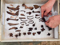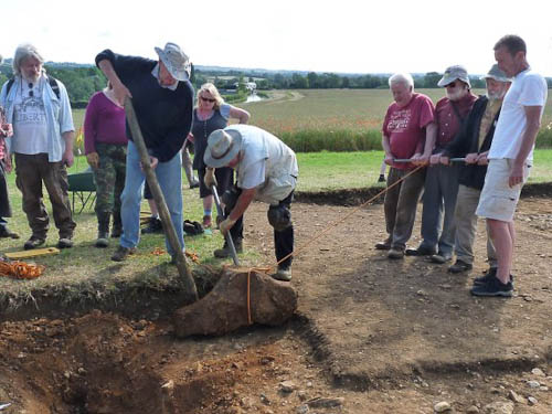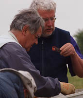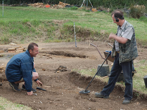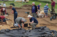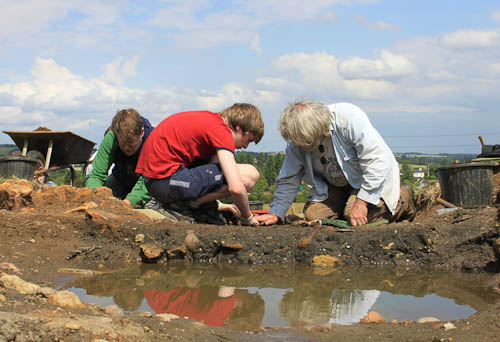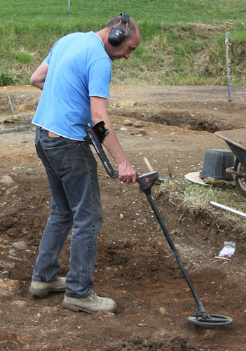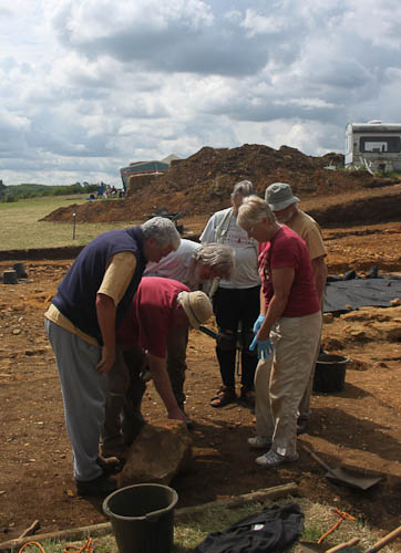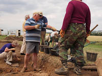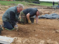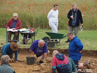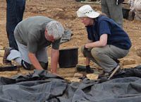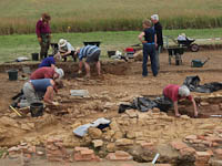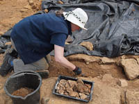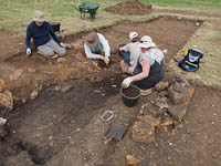 | Day 12 of 20: Tuesday 28 June What a grey day. At least it didn't rain on site although it did (a bit) in MK, and Wimbledon was well wet. An exciting development today in Sandra's Room 7. In generally taking the level down... ![]() ...there was an unexpected find... ![]() ![]() We'll be hearing more about this in due course! The NARC team were on site.. ![]() ... and found a couple of things... ![]() Photo © Tony Smithurst, NARC ... probably 3rd century, and... ![]() ... medium sized and "not modern". Was a kingdom lost? Answers on a postcard please. |
