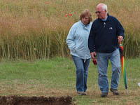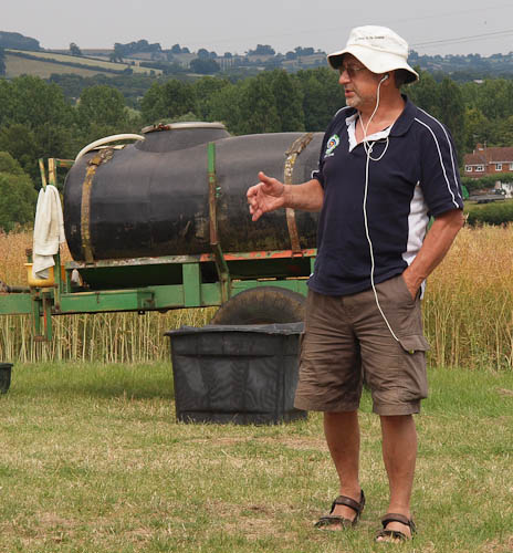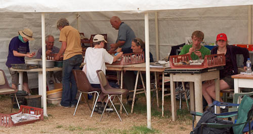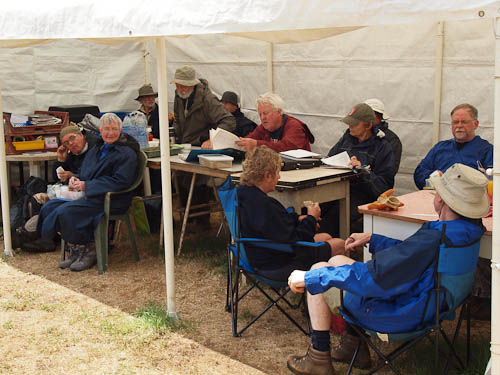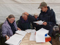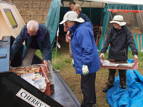 Just as the rain started our second group of visitors arrived. They are mostly members of The Friends of Raymond - so am I. Raymond is the last wooden-hulled commercial narrow boat (a butty - no engine) ever built in the UK (in 1958): the Friends maintain and operate Raymond and it's motor-boat Nutfield by running them up and down the canals from show to show during the season. In that context and on their own boats, these people have passed the Whitehall site on the canal many, many times during the last 10 years, and often wondered what the heck was going on up the hill. This was their chance to find out. They were very impressed!