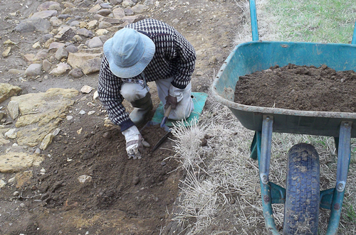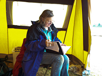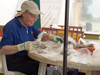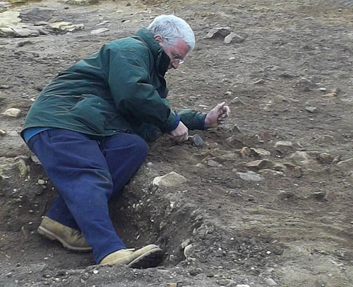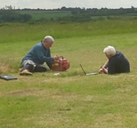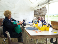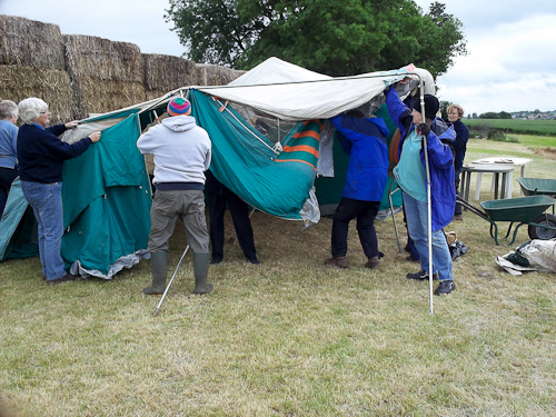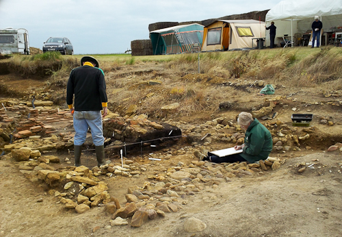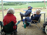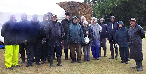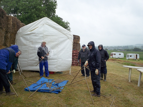 Day 5 of 20: Friday 15 June Last day of Week 1 already (now when have I written that before?). I tried a little experiment today - seeing how well I could manage without my digital camera. OK, for the very frist time ever, I forgot to pack it - I won't bore you with the existential problems of having too many bags to hold cameras! Anyway, my wifely stringer lent me hers, and I must say that even though it cost more than 100 times less than my kit, it produced some excellent results. The first photo is hers - the rest are mine. It was wet under trowel this morning ... It was windy too!! Sitting in the white tent was (I guess) a bit like sitting in a tea-clipper in the Roaring Forties, with the sails poorly set - deafening, and quite exciting. At one stage bits of tent frame started to fall off, and Norman and Lesley did some rope weaving to help hold it all together ... At the eastern edge of the site they carried on trowelling ... Nothing much was revealed except what might be pits of waste materials. The square patch is one of the test pits we dug back in, we think, 2006. But there was a substantial cluster of nails, each of which was carefully surveyed ...