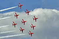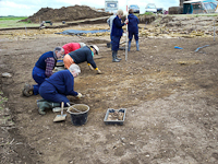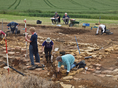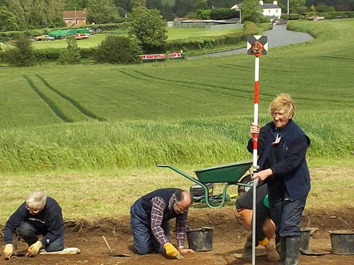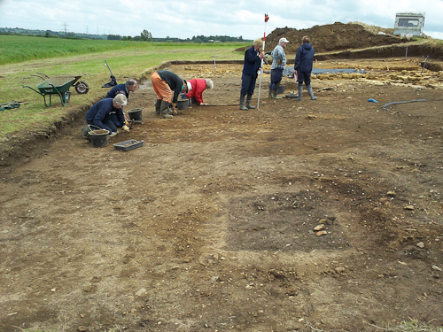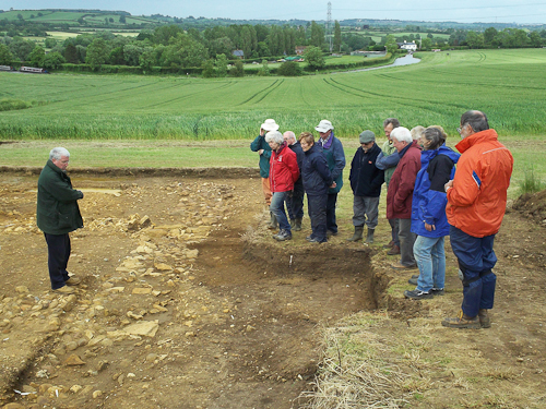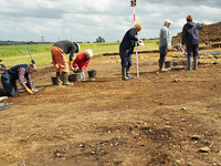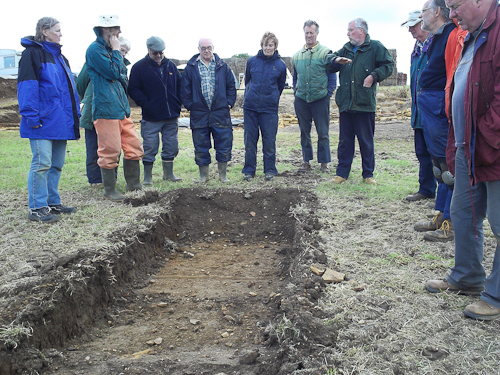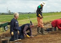 This was the trowelling line-up at the end of play ... Note that Steve at far left has found a hole to sit in while he explores one of the possible pits - much more comfortable. At the south end of the site, Fred was establishing that what the geophys suggested is in fact the case - that there are no more buildings under the baulk ... Just as well - if there were any more structures, we'd (i.e. Nick) would have to move the spoil heap AGAIN. Steve began the site tour at Fred's bit. We had a look at the new excavation along the east side and finally we studied a trial trench started by Olie yesterday ... It's beyond the eastern baulk up against the crop line. It will be excavated further to see what might be going on in the mound under the crops a bit further east. There is a feature across the middle of the trench (at the very bottom of the photo frame) which is probably a "modern" field drain. Otherwise, Steve outlined the detailed work to be done next week - apart from trowelling down further all over the newly uncovered eastern section of the site, it's mainly a matter of small investigations here and there to confirm theories and puzzle out some of the more intriguing areas of the site (it was VERY windy, and I couldn't hear every word Steve said). The drains will be examined and the main drain excavated all the way to the northern baulk. But my best of the day was the Red Arrows flying over towards the South West - a wing of five and a wing of four. They were very noisy too. Time for new batteries in the hearing aids after they've been so busy Have a good weekend.