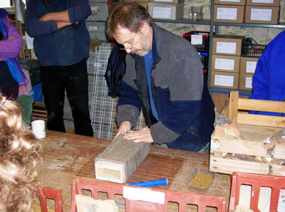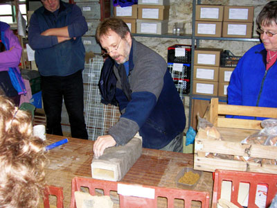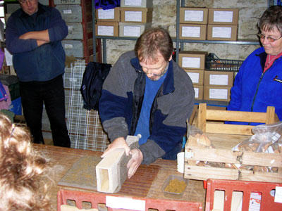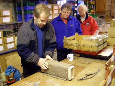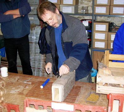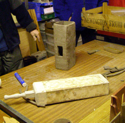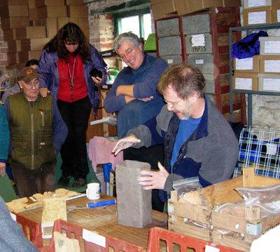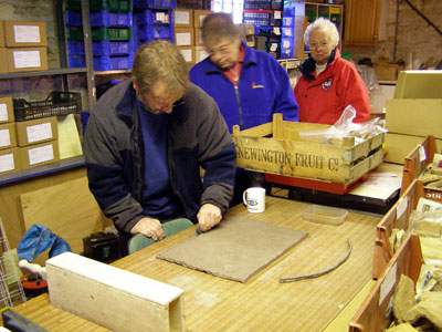 Martin used stoneware clay for the reconstruction with sharp sand inclusions. He produced the mortar key design by using a five tooth comb and this accurately replicated the patterning seen on tiles recovered from the Whitehall site. The critical factor for success is to ensure that the clay is the right consistency: too wet and it will not slide off the former; too dry and it will not bend without cracking, causing weak points when fired.