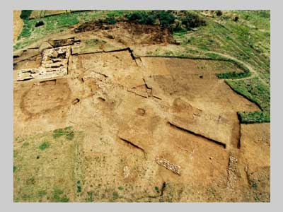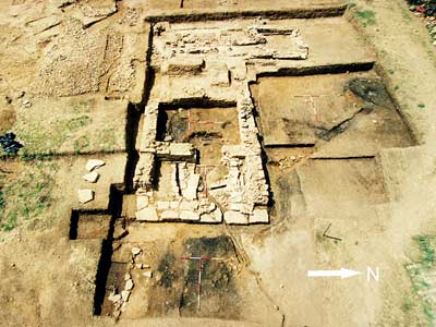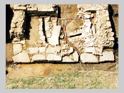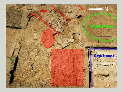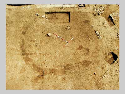 The probability of occupational activity during this period is further reinforced by the recovery of pottery of this date from elsewhere on the site. The importance of the hall within the context of post Roman occupation is difficult to assess and clarification of its role must await further excavation. However the existence of a timber hall also suggests continuity of communal life, which is consist with our interpretation of the social organisation, reflected in the villa buildings. Interestingly the timber posts contained within the post pits had all been burnt, presumably signifying the end of this phase of occupation. The reason for the burning of the hall cannot be determined and may have been as much to do with structural renewal and occupational shift as to warfare and conquest. Courtyard The courtyard surface had been covered with cobbles and graduated layers of gravel presumably to provide the timber hall with an external working area. Underneath these Post Roman surfaces are portions of walling and a flag stone floor. These features are consistent with the survival of structural elements of the east wing of the villa. These findings are extremely exciting because it suggests that although the upper sections of the building were levelled, the floors and foundations of the earlier Roman building may well have been buried and survive uncontaminated by later historical events. The excavation of the Post Roman phases and the possible subterranean elements of the villa will continue in 2003. Bathhouse The continued archaeological investigation of the bath house and the water supply and drainage system has also resulted in a great deal of information concerning the structural development of this building. Unfortunately the anticipated water tank, believed to be situated under the 4th century foundations of Room 4 did not materialise. However a system of culvert channels of an earlier phase of the bath house were located. The culvert system provided drainage for the bath house and also, more surprisingly, some elements of the villa range. The Room 4 foundation stratigraphy was fairly barren of artefactual material except for a 4th century Nene Valley Colour coated flagon which had been deliberately smashed and ritually deposited possibly to commemorate the changing role of the building or the structural alterations to the bath house. Connected to the drainage culverts via an opening in the north wall of the bath house we excavated a stone lined channel about 6 metres in length. The channel was covered by limestone capping stones and was connected to a sump or feeder tank for collecting water from the spring. Although only half a metre in depth and over a metre wide the clay lined pit appears to have acted as a reservoir and settling tank to supply a constant clean water supply to flush the drainage channels of the bath house. A partially excavated timber beam situated at the junction between the sump and the stone lined water channel may well have been part of a wooden sluice used to control the water flow. These findings hint at the sophistication of the water supply and illustrate some of the complexity of water management. Unfortunately the method of supplying water for the purpose of bathing is still very unclear. - reconstruction The excavation of Room 3b in the bath house has provided some excellent data on a major phase of reconstruction and development of the bath house complex during the late 3rd century AD. Excavation of the collapsed debris of the interior walls of the bath house and the foundation material supporting the raised floor level of Room 3b revealed a lower floor level associated with an earlier bath house phase. The context consisted of organic material overlaying an extension of the capped drainage culverts found under Room 4. Several coins were recovered focusing on the reign of Gallienus (253-268 AD), Cladius 11 (268-270 AD) and the Gallic empire of Postumus and Victorinus (259-270 AD). A few nearly complete vessels diagnostically datable to the 3rd century were also excavated. The context of the deposition of this organic material suggests that the layer was deposited over an extremely short period of time and probably is best interpreted as a opportunistic response to waste disposal for material from elsewhere in the villa complex. - organic finds Amongst the organic material retrieved were abundant amounts of animal bones, wooden artefacts and environmental evidence. We were able to identify elements of a wattle hurdle, barrel staves and the barrel bung. A discarded lathe plug from the production of a wooden bowl, sawn off-cuts and a fragment of an iron saw thrown away with the rubbish indicated carpentry waste. In addition the range of bones from this sealed context suggest an extensive dietary choice was available to those living on the villa estate at least in the late 3rd century. Notably among the traditional animal fare obtained from cattle, sheep, pigs and oysters were fragments of eggshells from chicken and duck eggs, bones of freshwater and saltwater fish and the skeletal remains of songbirds and bones from small edible mammals. The environmental material appears to be equally rich as is indicated by the survival of a peach stone. One is tempted to see the assemblage as kitchen waste collected from elsewhere around the villa which was dumped in room 3b to help build up the floor layer. However only the examination in the future by specialists of both the organic and bone material will provide us with the level of detail needed to fully understand and interpret the meaning of this deposit. A writing stylus was also recovered from the deposit and is of interest because it suggests that there was a degree of literacy amongst the villa community. It is hoped that further work in this area of the bath house will produced a lot more comparable evidence concerning the social interaction of people living on the estate. Round House Excavation inside the di
