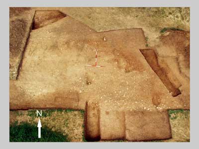 The main evidence for the Post Roman hall is two parallel lines of post pits for holding timber posts of considerable size. These post pits are orientated along an east west axis at a tangent to the east wing of the villa and are cut into the levelled masonry remnants of the villa east wing. The layout suggests that we are looking at the remains of a building on the scale of a dark age timber hall.